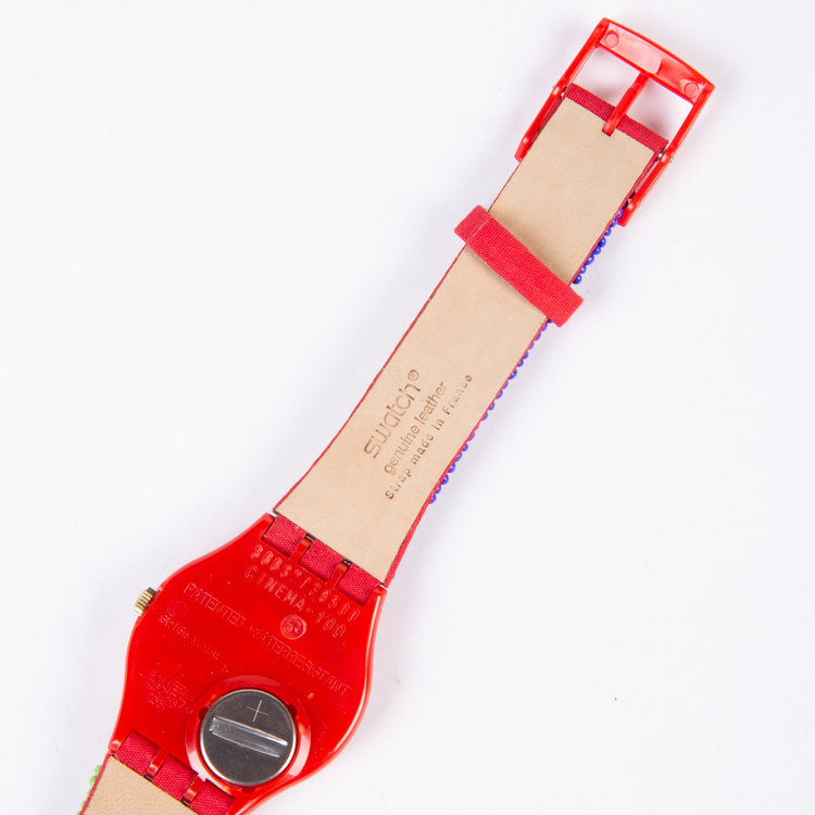 Swatch, 'Despiste- Pedro Almodóvar', 'Wheel Animal- Not Vital', 1991/1995. Kunststof, leder. 12,4 x 4 x 1,5 cm. 'Despiste - Pedro Almodóvar' (GZ 142) met lederen bandje versierd met blauwe rode witte en groene kralen in kunstig patroon. 'Not Vital', (GZ 120) Swatch werd in 1983 opgericht en onderscheidt zich als Zwitsers horlogemerk met zijn slimme techniek en bijzondere ontwerpen, die in beperkte oplage werden uitgevoerd. Vanwege de grote hoeveelheid verschillende designs en samenwerkingen werden de Swatch horloges collectors items die nog steeds wereldwijd worden verzameld. Oplage: Despiste 30037/36500, Not Vital 5th edition 0394. Conditie: De horloges zijn in zeer goede ongedragen conditie in originele verpakking.