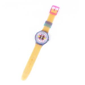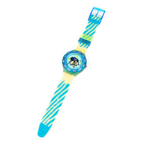 Swatch 'Swordfish', 1993; Swatch 'Ice Party', 1995. Swatch Scuba 200 'Swordfish' SDG 101 uit 1993, met blauw/geel gestreept kunststof polsband en heeft een afbeelding van een zwaardvis op de wijzerplaat; Swatch Scuba 200 'Ice Party' SDS 100 uit 1995, met geel kunststof polsband. Beide horloges hebben een draaibare lunette, zijn waterbestendig en hebben een precisie quartz uurwerk met batterij. Conditie: De horloges bevinden zich in originele verpakking en zijn ongedragen, polsbandjes kunnen verzwakt zijn door verstrijken van de tijd. Afmetingen verpakking: ca. 24,5 x 6 x 2 cm.