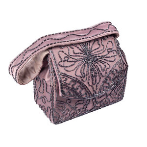 Kralentas van taupe zijde versierd met sierlijk bloemmotief. In het tasje zit een opbergvakje met spiegel en twee haarschuifjes. Datering: jaren '50. Conditie: redelijk goed, hier en daar missen enkele kraaltjes en de stof heeft op sommige plekken wat verkleuring en vlekken. Afmetingen ca.: 15 x 17 x 8 cm, hoogte incl. hengsel is 30 cm.