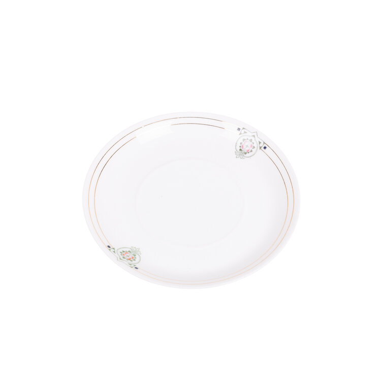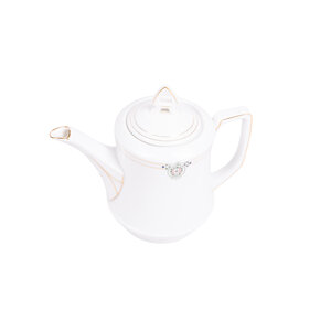 Theeservies, 20-delig. Theeservies met een witte basiskleur en versieringen in goud, roze en groen. Het servies bestaat uit een theepot, suikerpot, melkkannetje, kom, 8 kopjes en 8 schotels. Bovenop de deksels zitten decoratieve handvatten. Datering onbekend. Conditie: het servies vertoont sporen van gebruik, de gouden lijnen zijn hier en daar vervaagd. Afmetingen: theepot ca. 16 x 18 x 10 cm; suikerpot ca. 11,5 x 13 x 9 cm; melkkan ca. 9 x 11 x 7 cm; kom ca. 6,5 x Ø12 cm; kopje ca. 4,5 x 7,5 x 9,5 cm; schotel ca. 1,5 x Ø13 cm.