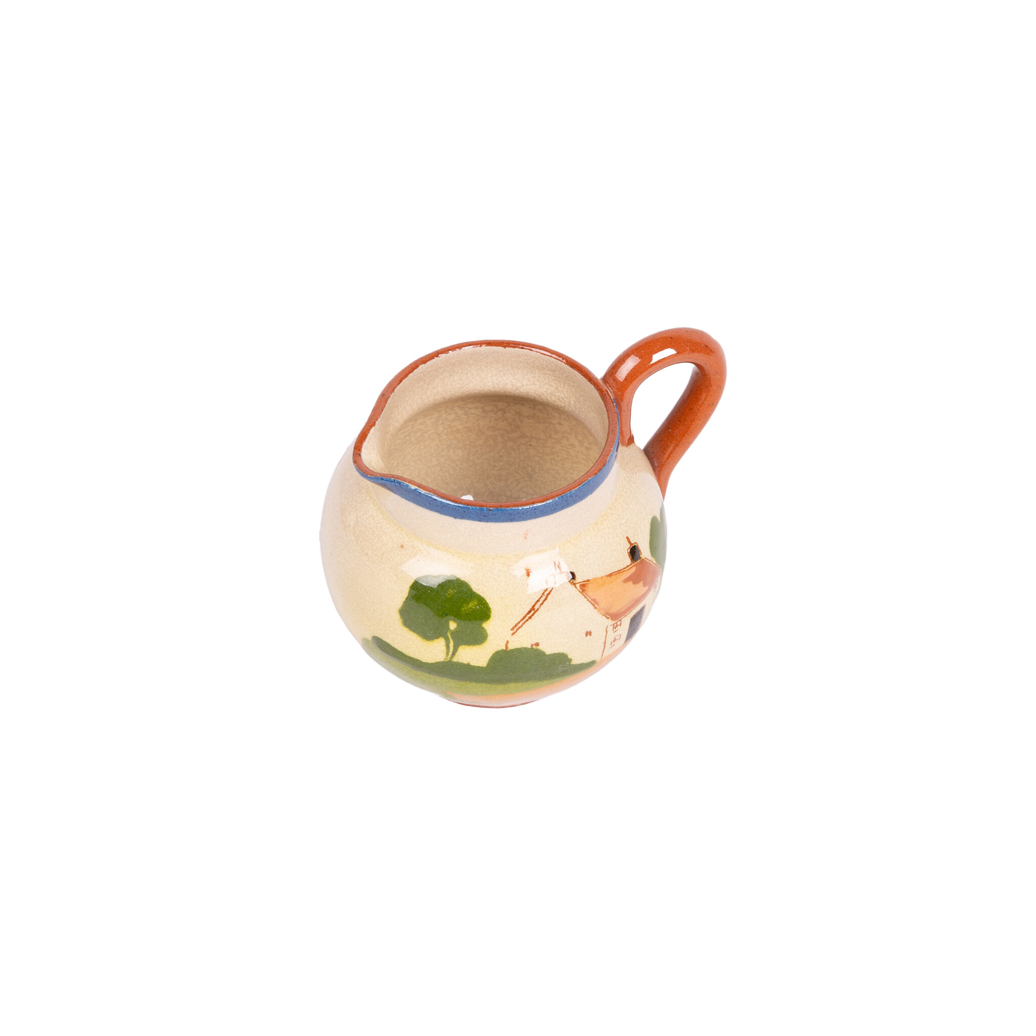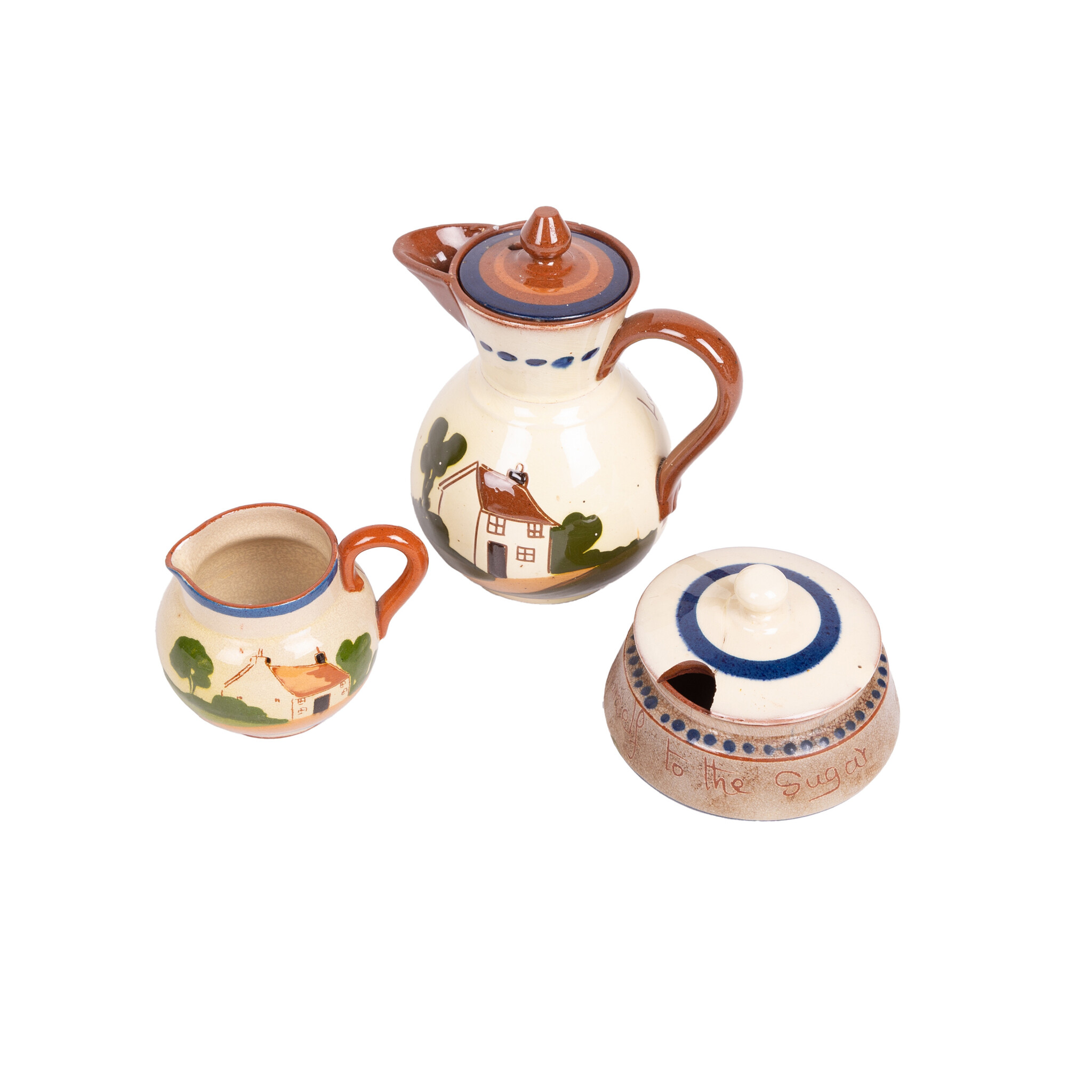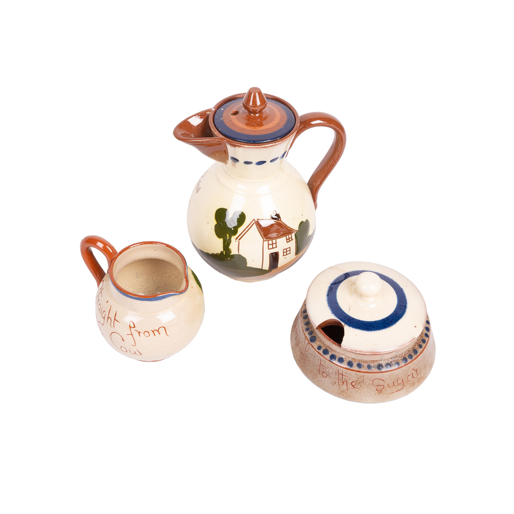 Theepotje, suikerpot en melkkannetje van Torquay Pottery/Torquay-aardewerk. Vintage eenpersoons theesetje in crème en bruin, versierd met handgeschilderde patronen en teksten (Mottoware). Datering: 20ste eeuw. Conditie: het servies vertoont sporen van gebruik, de suikerpot heeft een barst. Afmetingen: theepotje ca. 12 x 13 x 9 cm; suikerpot ca. 5 x Ø9,5 cm; melkkannetje ca. 6 x 10 x 7 cm.