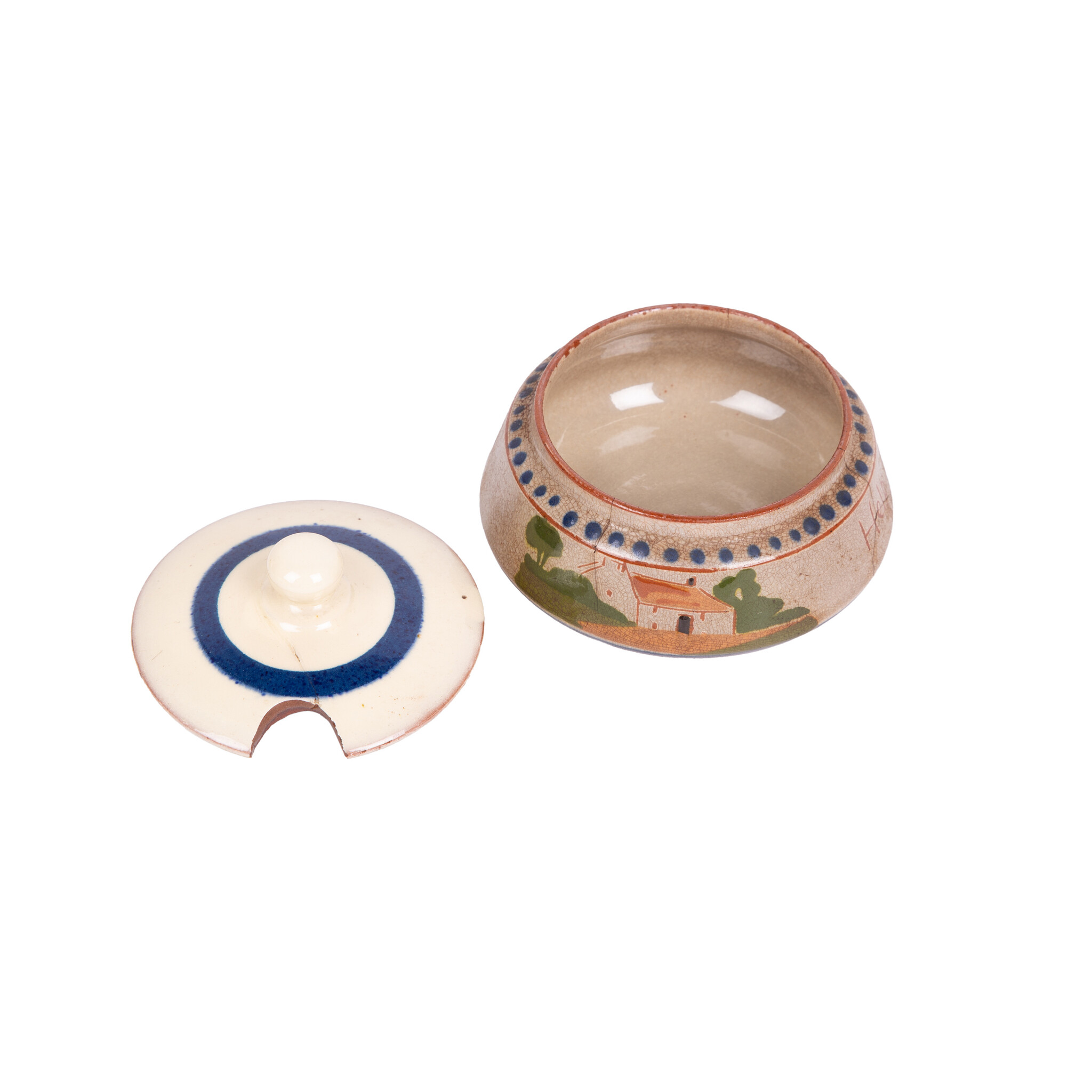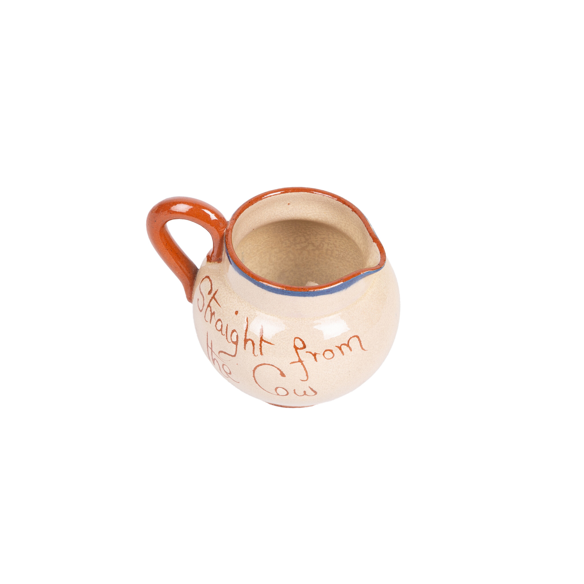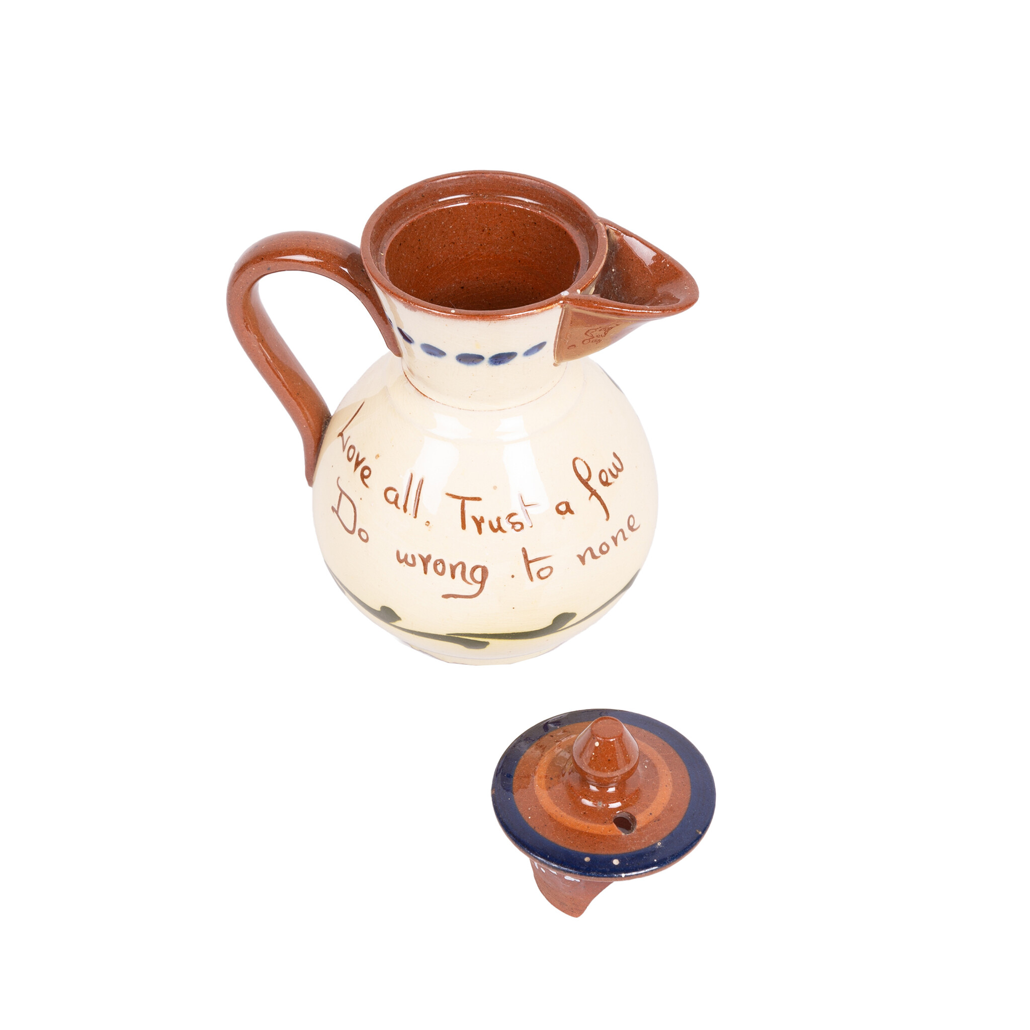 Theepotje, suikerpot en melkkannetje van Torquay Pottery/Torquay-aardewerk. Vintage eenpersoons theesetje in crème en bruin, versierd met handgeschilderde patronen en teksten (Mottoware). Datering: 20ste eeuw. Conditie: het servies vertoont sporen van gebruik, de suikerpot heeft een barst. Afmetingen: theepotje ca. 12 x 13 x 9 cm; suikerpot ca. 5 x Ø9,5 cm; melkkannetje ca. 6 x 10 x 7 cm.