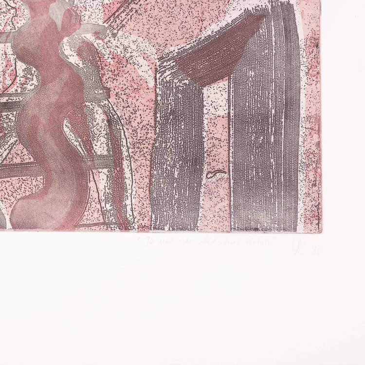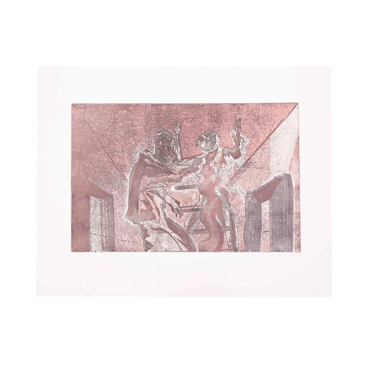 Th. Koolhaas, De val van het huis Usher, 1980. Kleurenets op papier zonder lijst, 1e druk. Afbeelding van twee ruziënde mensen in de kleuren zwart en rood. Signatuur rechtsonder. Conditie: het papier toont hier en daar gebruikssporen. Afmeting papier: 49 x 63 cm.