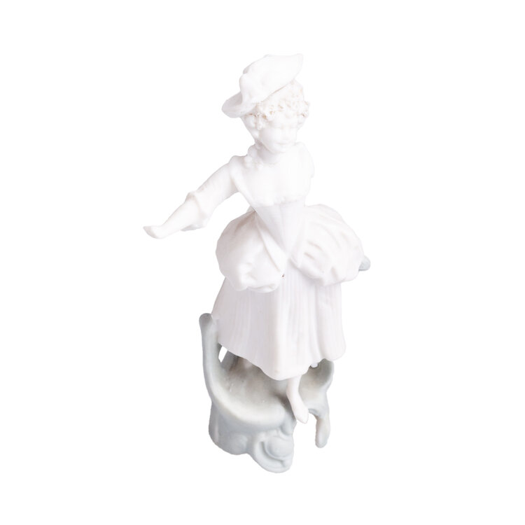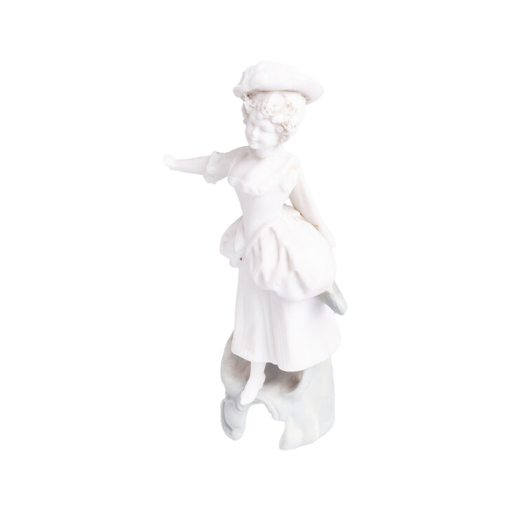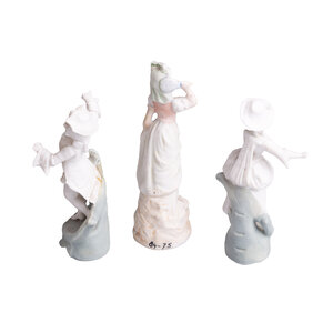 Drie beeldjes van biscuitporselein. Setje van een dame en een heer: een adellijke dame op groen voetstuk met grote hoed op krullenbol. Lange witte jurk op heupen breed gedrapeerd met 3/4 mouw. En een heer (jonker) op opengewerkt groengekleurd voetstuk met hoed op krullenbol, pandjesjas met daaronder vest (ca.10 x 5 x 5 cm); Beeldje van een dame met lang haar en in rechterhand een haarborstel. Zij heeft een lange witte jurk van goudstippen voorzien, boven- borststuk rode gekleurd (ca.12 x 4 x 4 cm). Datering: onbekend. Conditie: van het setje met de dame en de heer is de heer gebroken en gelijmd, de dame mist een arm.