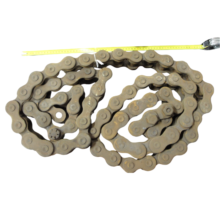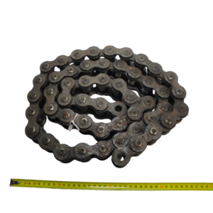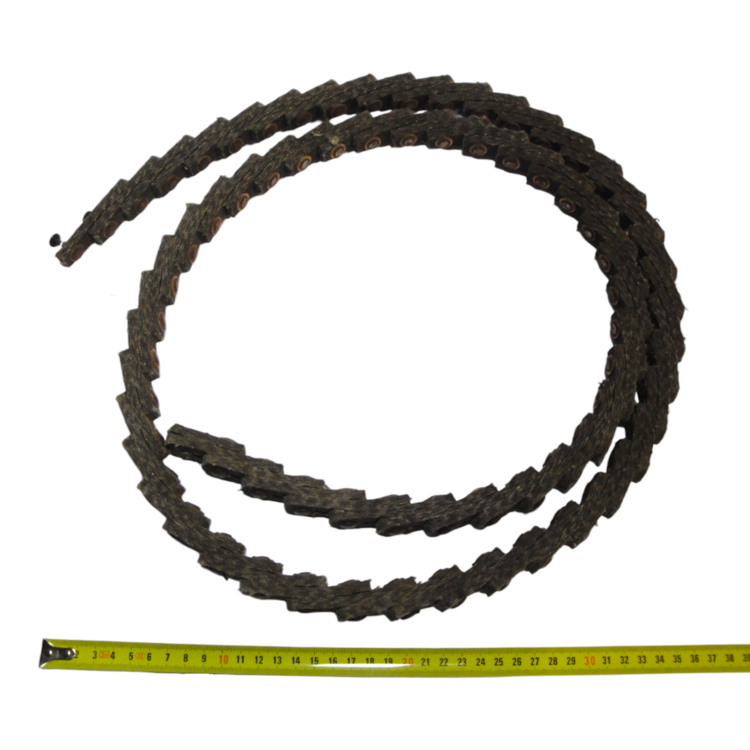 Ketting voor een mechaniek van metaal. Twee kettingen van metaal voor een machine. Snaar van textiel met spijkers of nagels. Datering: onbekend. Conditie: redelijk tot goed. Afmetingen kettingen: ca. 5,0 x 3,0 x 200,0 cm en 12,0 x 2,0 cm en 6,0 x 4,5 cm. Afmetingen snaar: ca. 198,0 x 3,5 x 3,5 cm.