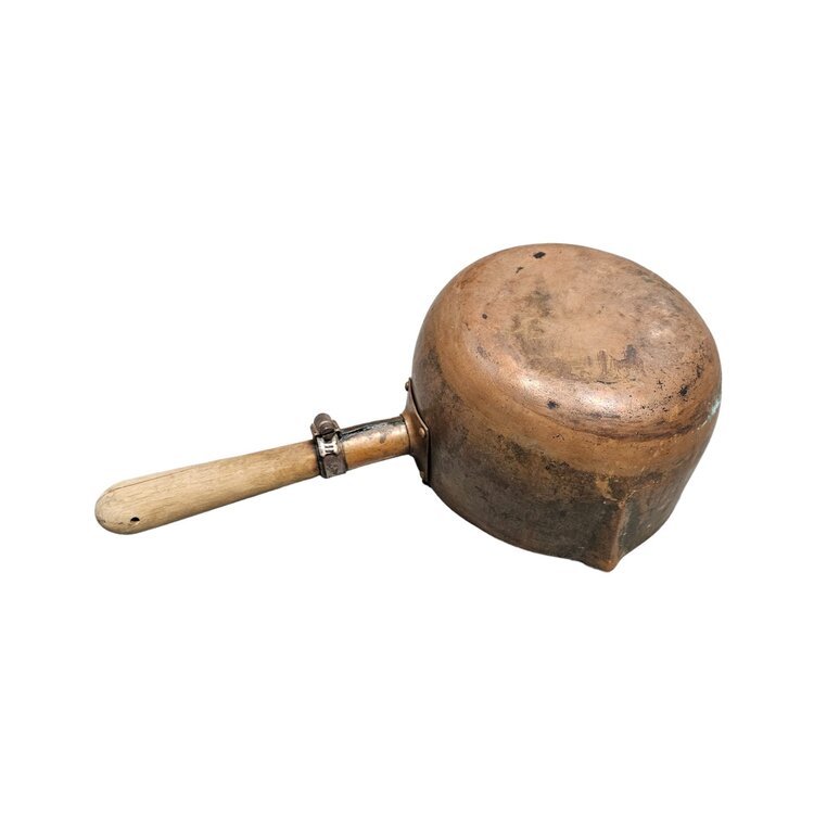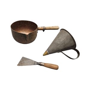 Drie chocolade gietattributen. Bestaande uit koperen pan, trechter en plamuurmes. Datering: 20ste eeuw. Conditie: pan heeft deuken, punt van plamuurmes is omgebogen. Afmetingen: pan ca. 38.0 x 22.0 x 12.0 cm, trechter ca. 23.0 x 23.0 x 16.0 cm, plamuurmes ca. 24.0 x 7.5 cm.