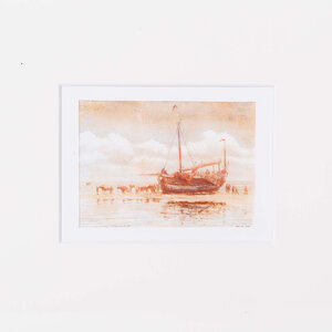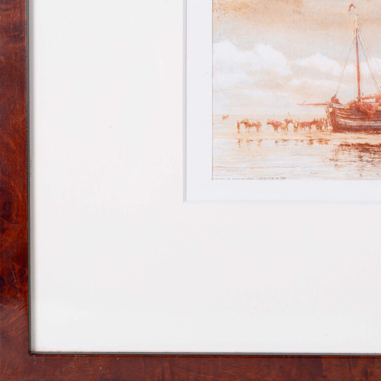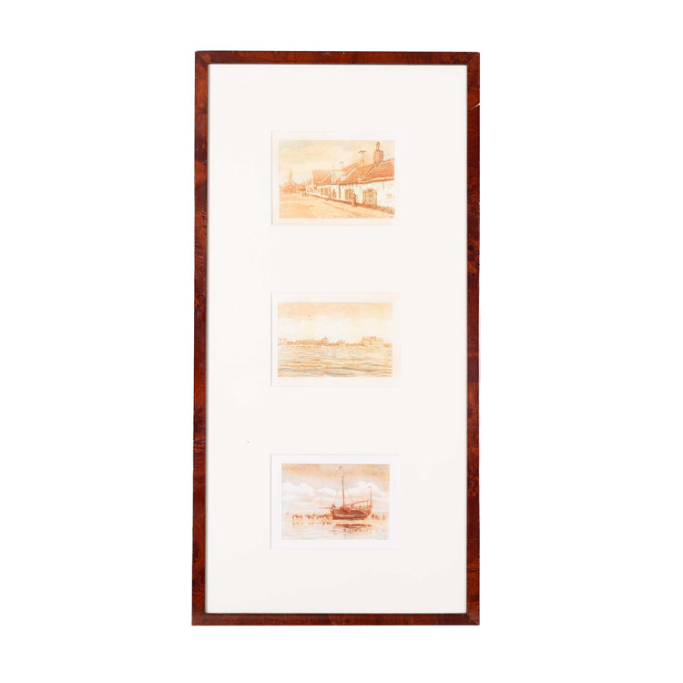 Drie ingelijste kleuren-afdrukken van Karel Kok in bruine lijst. Van boven naar beneden: zicht op een straat in Noordwijk, zicht op de Noordwijkse boulevard vanaf de zee gezien en een boot aan het strand klaar om uit te varen. Conditie: lijst toont lichte gebruikssporen, passe-partout verkleurd. Afmetingen lijst: 67 x 33 cm.
