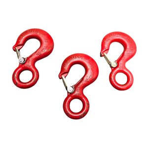 Drie grote karbijnhaken in de kleur rood. Datering: 20ste eeuw. Conditie: goed, sporen van gebruik. Afmetingen: ca. 16.5 x 9.5 cm.