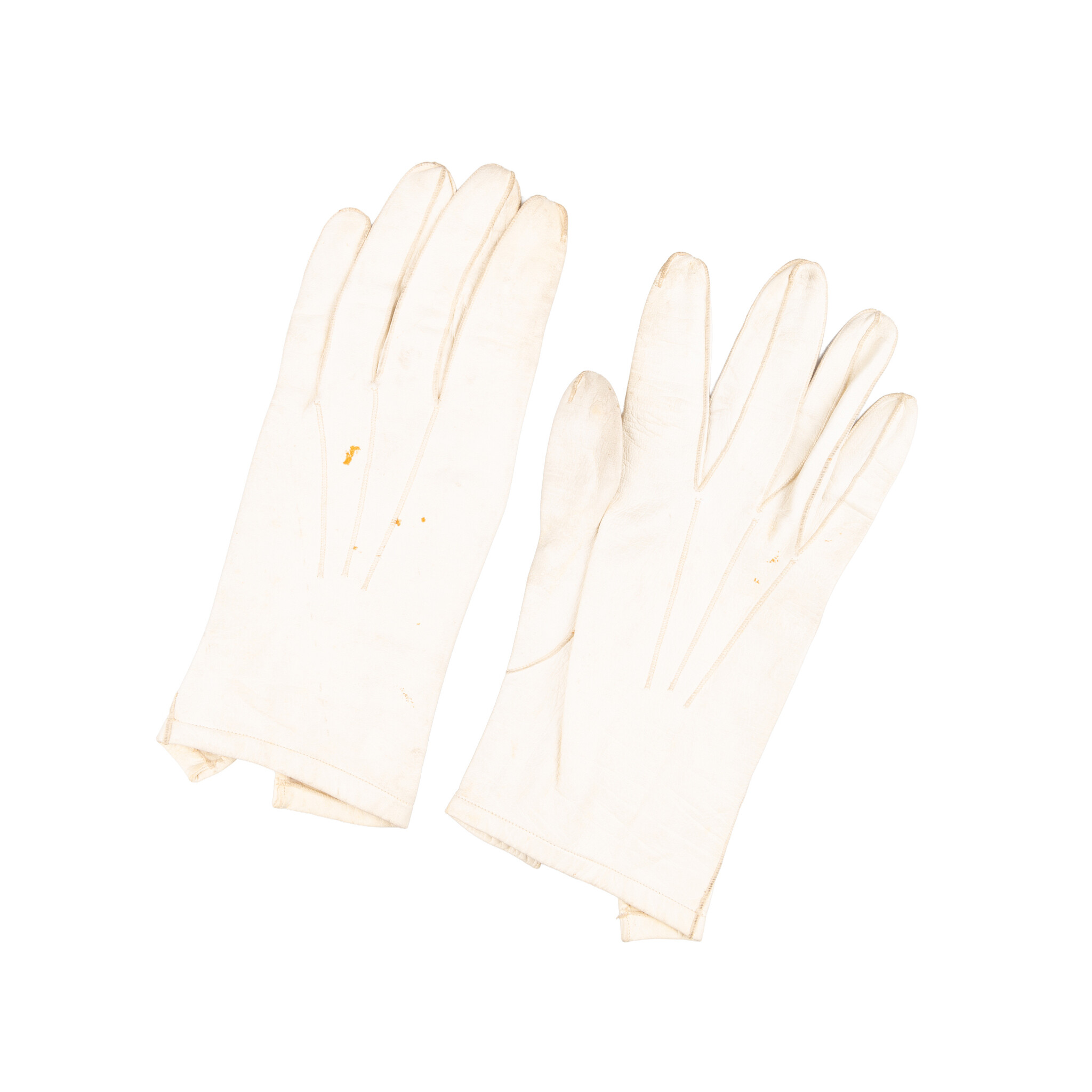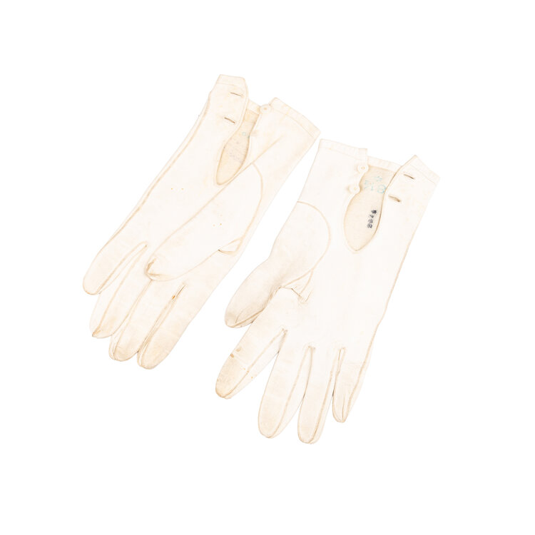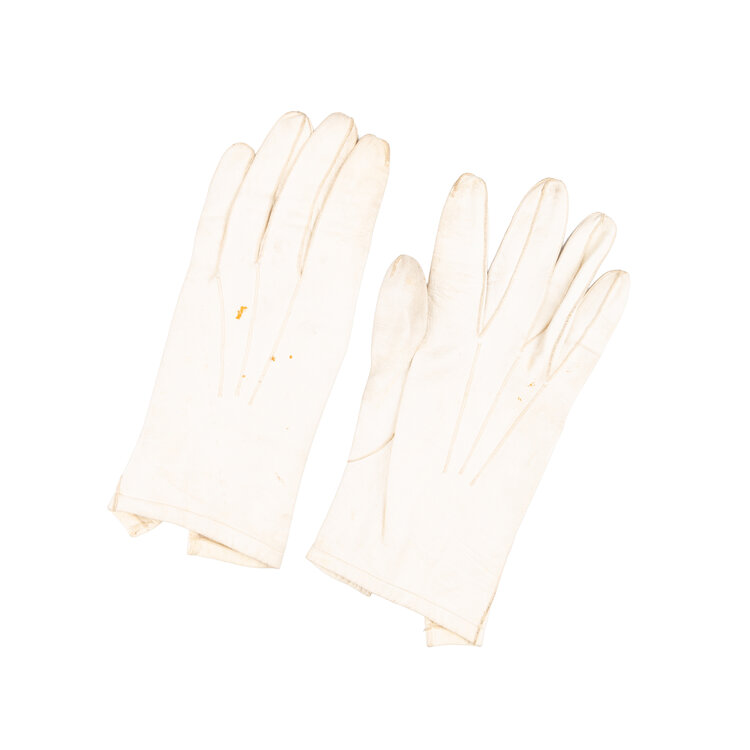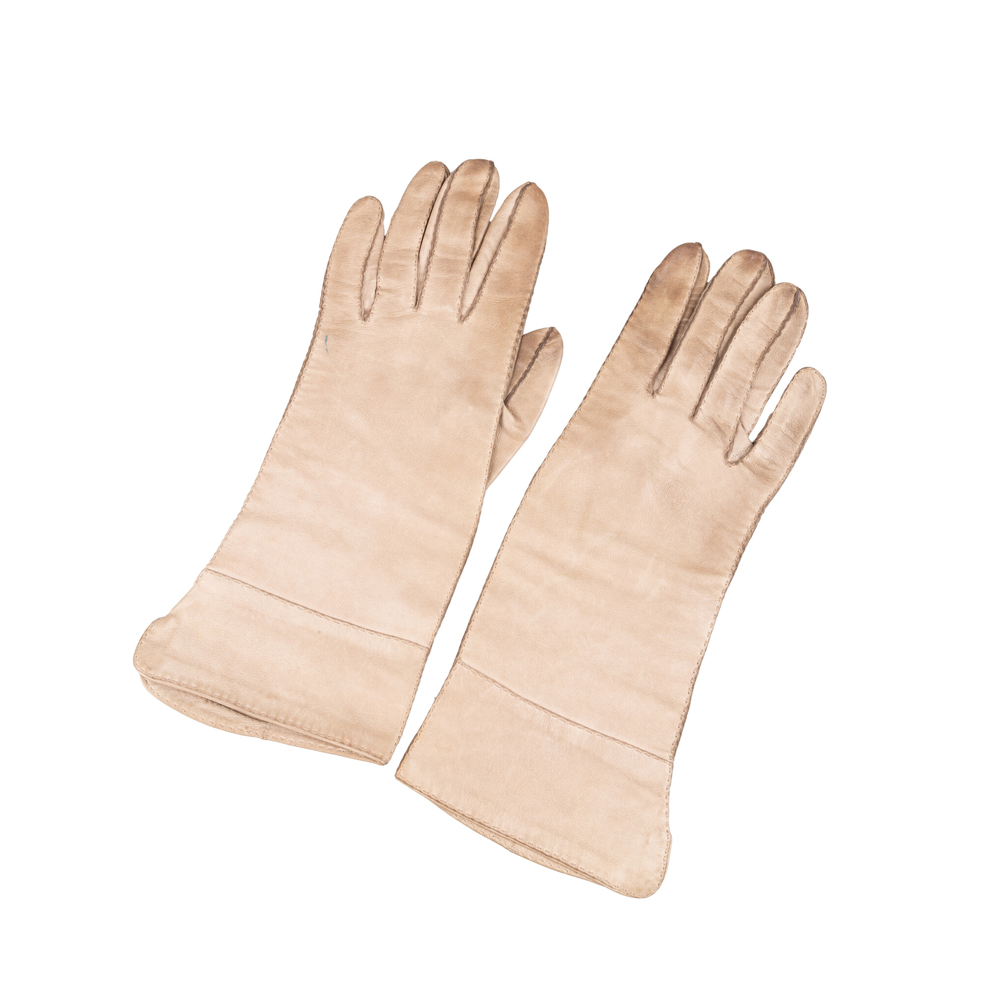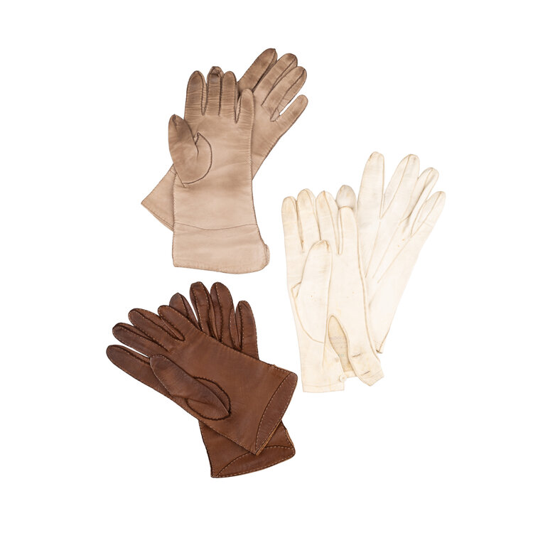 Drie paar leren handschoenen, 20ste eeuw. De handschoenen, ca. maat 8 1/2, zijn in de kleuren crème, lichtbruin en donkerbruin. Conditie: vertonen gebruikssporen, vlekjes. Afmetingen: variërend van ca. 23 x 8,5 cm tot ca. 28 x 9,5 cm.