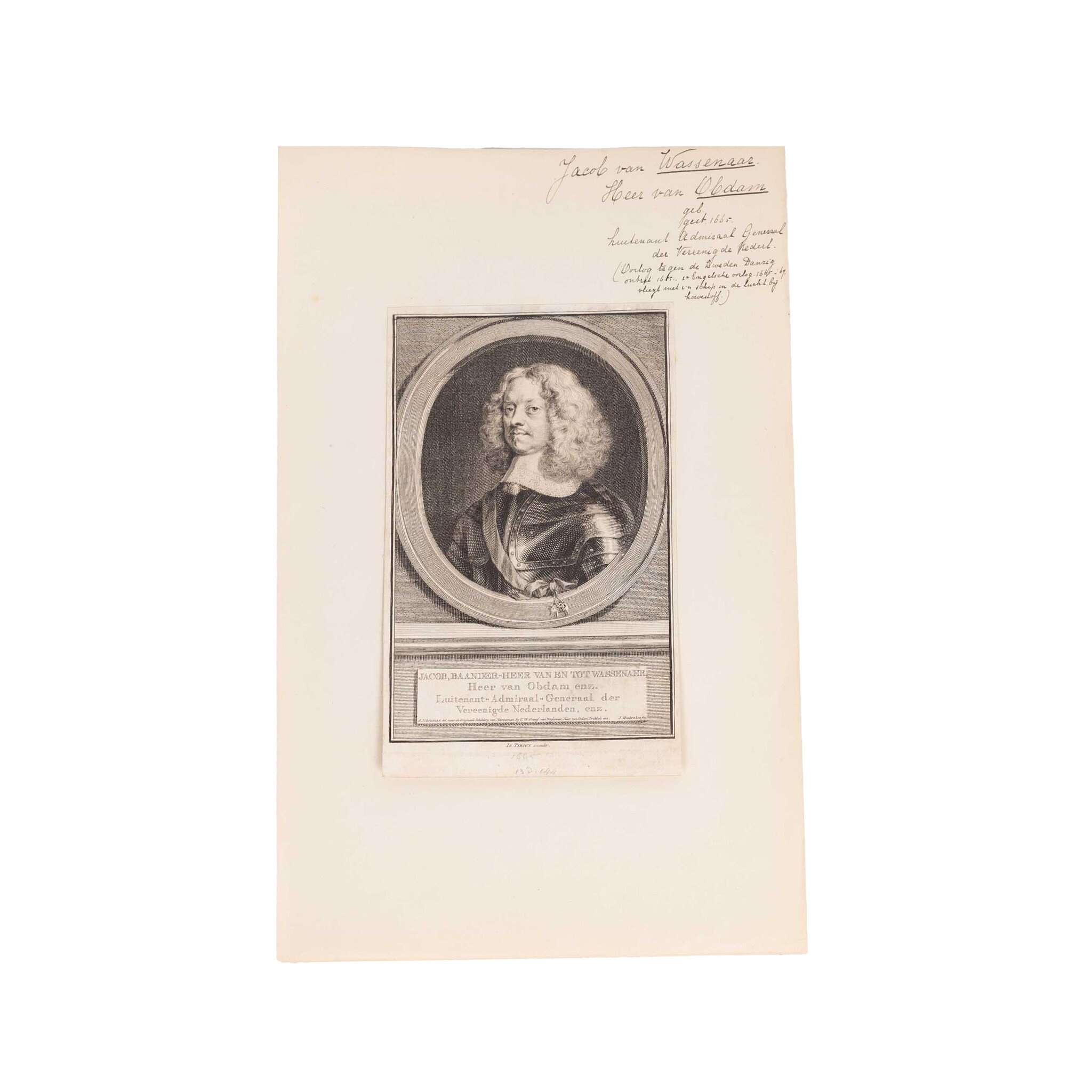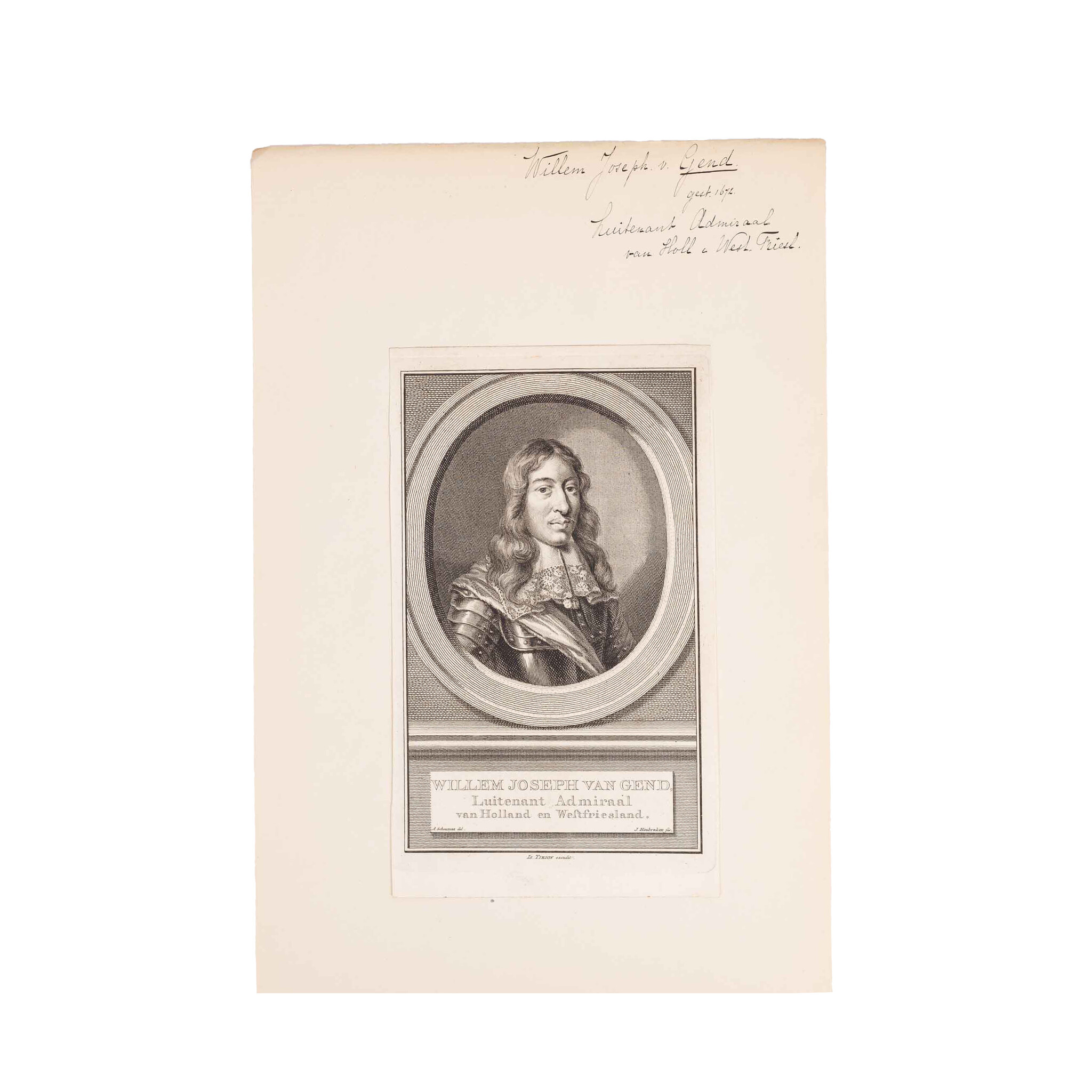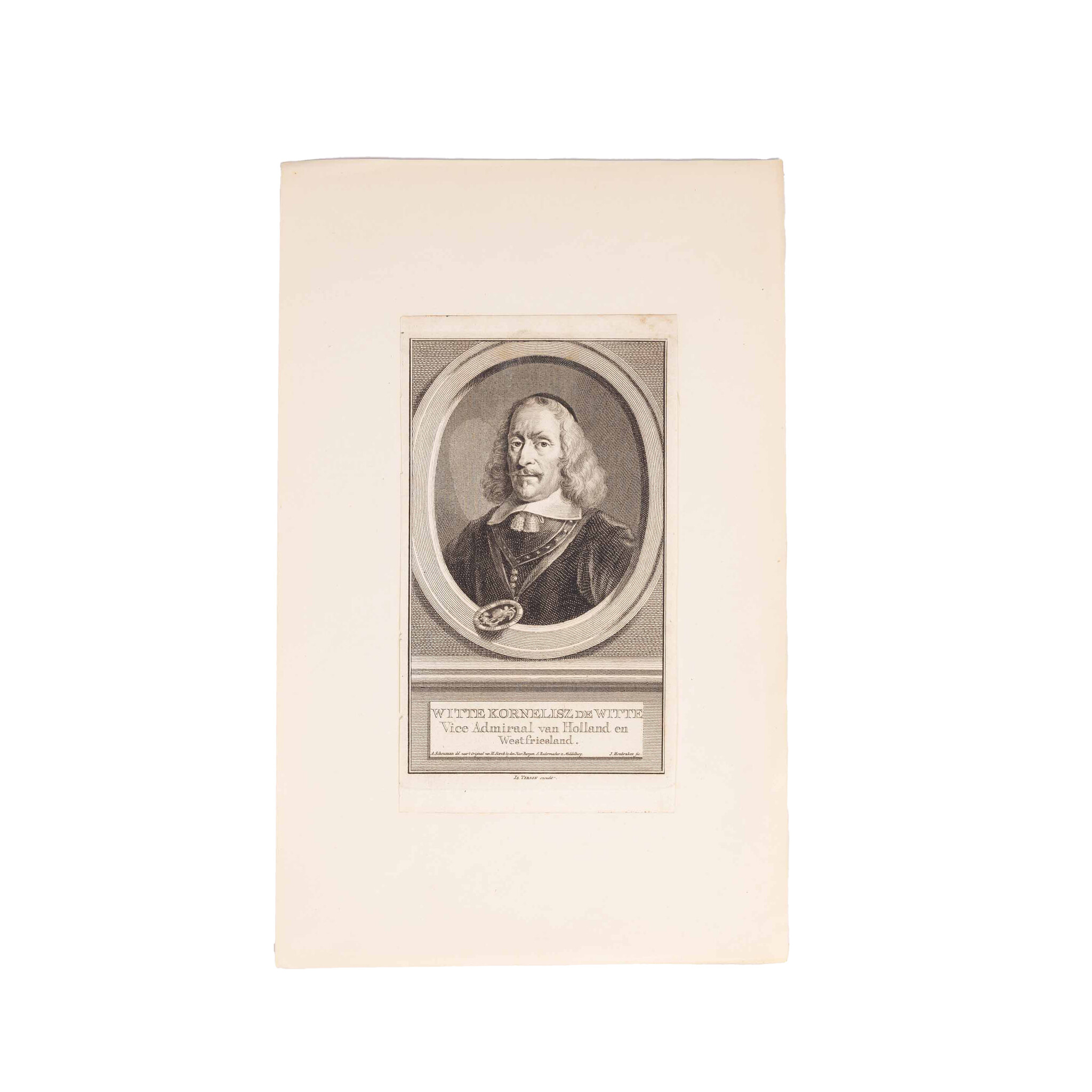 Prent 'Jacob Baander' (1610-1665) Heer van en tot Wassenaer, Heer van Obdam enz. Luitenant-Admiraal-Generaal der Vereenigde Nederlanden, enz; Prent 'Willem Joseph van Gend' (Winssen, 14 mei 1626 - Slag bij Solebay, 7 juni 1672), Luitenant Admiraal van Holland en Westfriesland; Prent 'Witte Kornelisz de Witte' (Hoogendijk, 28 maart 1599 - Sont, Denemarken, 8 november 1658), Vice Admiraal van Holland en Westfriesland. Gravures van Jacob Houbraken. De prenten zijn zwart-wit. Datering: ca. 1740-1760. Conditie: De prenten vertonen sporen van ouderdom. Verkleuring, vlekken en kleine beschadigingen aan de randen. De prenten zijn geplakt op een vel. Afmetingen beeldvlak prenten: ca. 17 x 10 cm.
