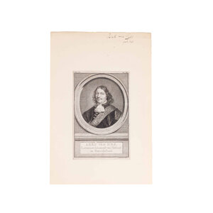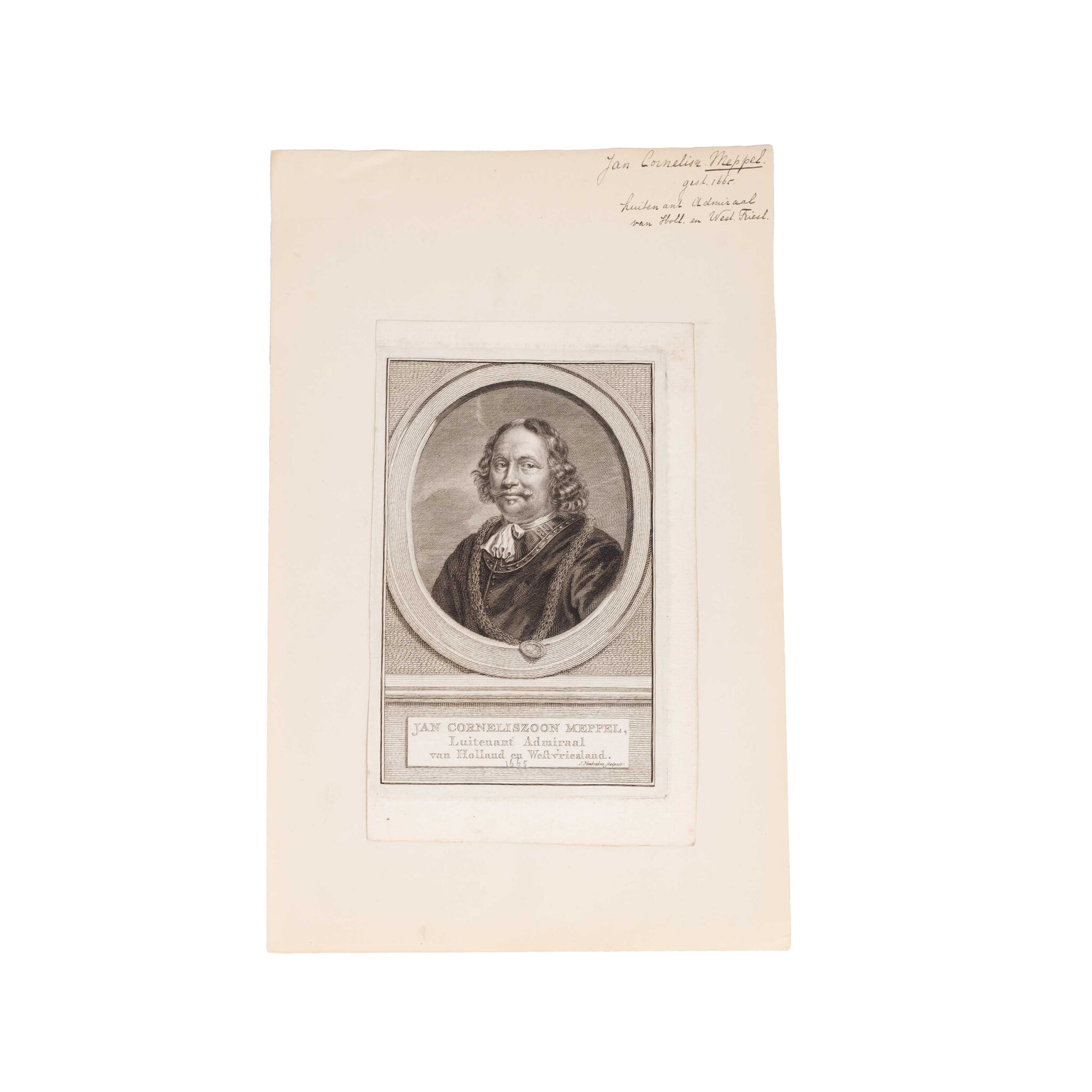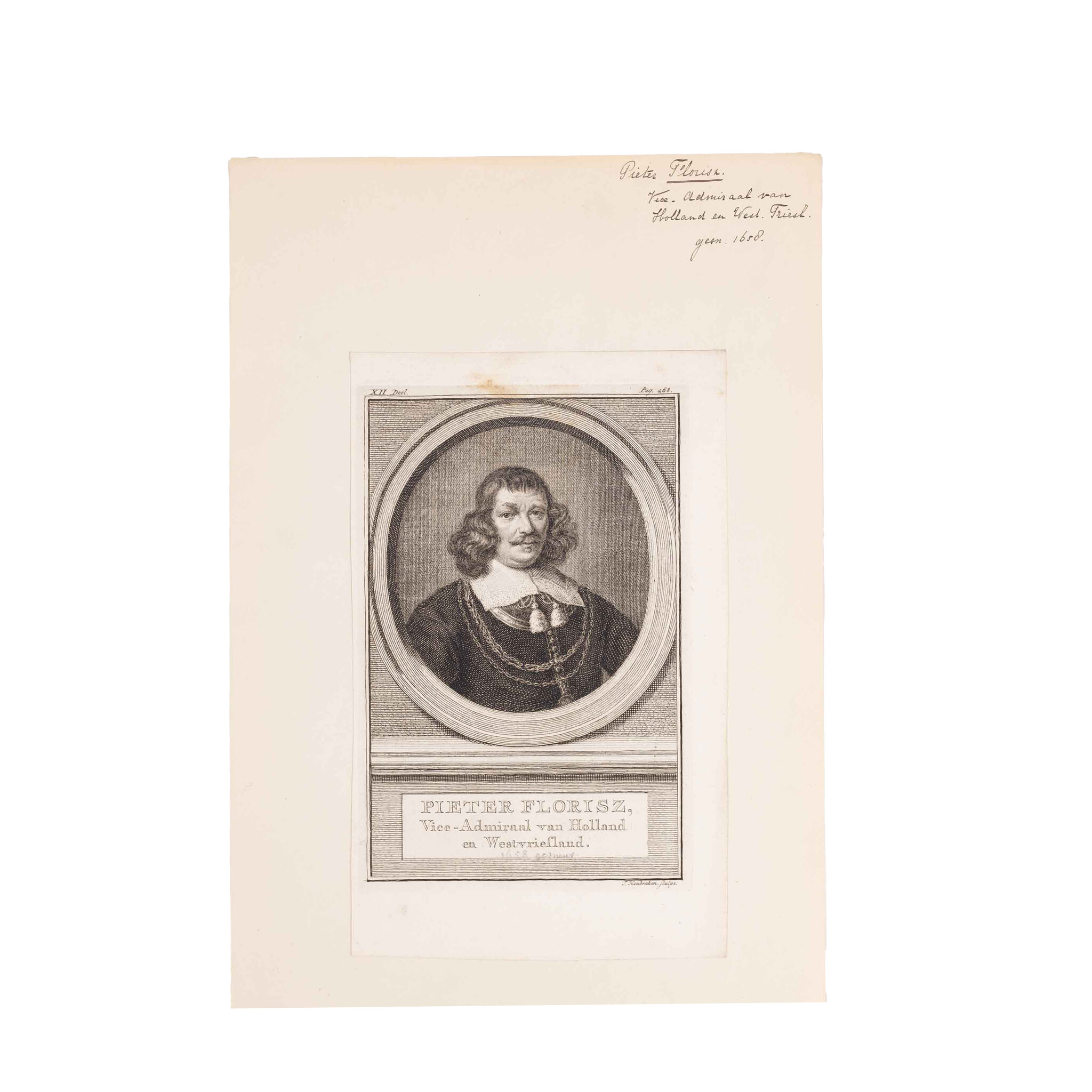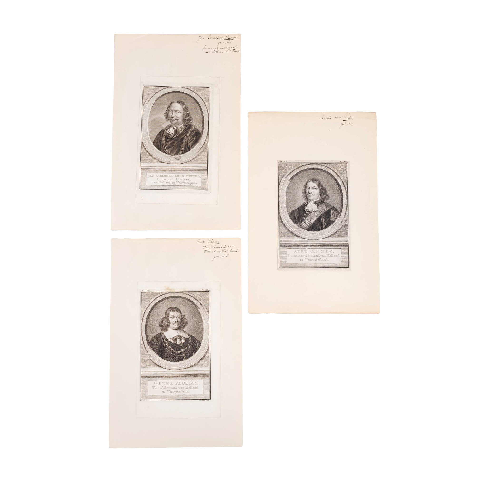Prent 'Pieter Florisz' (Monnickendam, 1602 of 1606 - Slag in de Sont, 8 november 1658), Vice-Admiraal van Hollland en Westvriesland; Portret 'Jan Corneliszoon Meppel (Hoorn, 1609 - Hoorn, 2 november 1669); Prent 'Aerd van Nes' (Rotterdam, 13 april 1626 - Rotterdam, 13 of 14 september 1693). Gravures van Jacob Houbraken. De prenten zijn zwart-wit. Datering: ca. 1740-1760. Conditie: De prenten vertonen sporen van ouderdom. Verkleuring, vlekken en kleine beschadigingen aan de randen. De prenten zijn geplakt op een vel. Afmetingen beeldvlak prenten: ca. 17 x 10 cm.