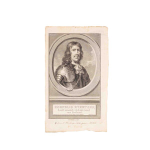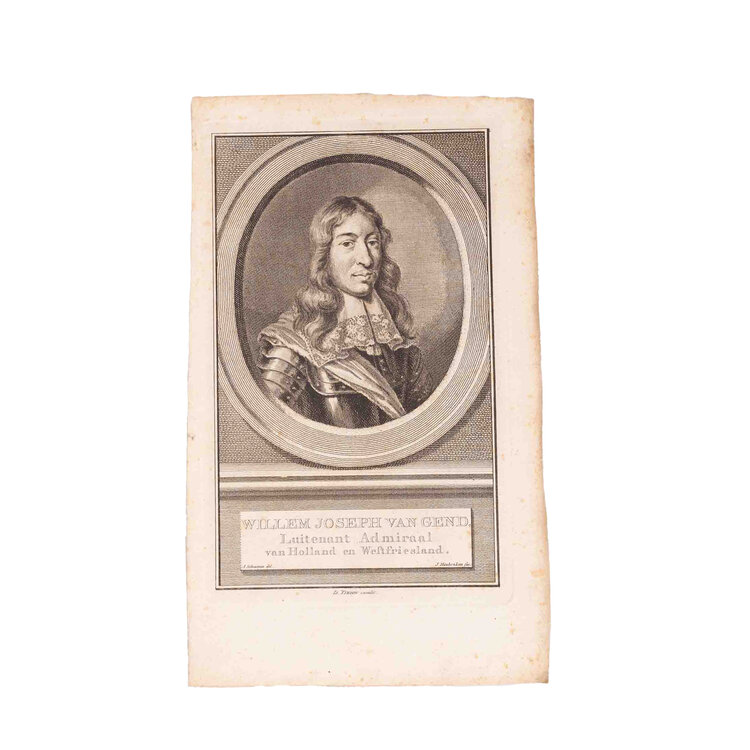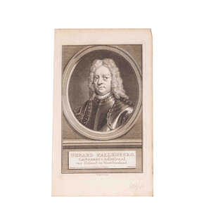 Prent 'Kornelis Evertsen' (Vlissingen, 4 augustus 1610 - Walcheren, 11 juni 1666), Luitenant-Admiraal van Zeeland; Prent 'Willem Joseph van Gend' (Winssen, 14 mei 1626 - Slag bij Solebay, 7 juni 1672), Luitenant Admiraal van Holland en Westfriesland; Prent 'Gerard Kallenberg' (1642-1722), Luitenant-Admiraal van Holland en Westfriesland. Gravures van Jacob Houbraken. De prenten zijn zwart-wit. Datering: ca. 1749-1760. Conditie: De prenten vertonen sporen van ouderdom. Verkleuring, vlekken en kleine beschadigingen aan de randen. Afmetingen beeldvlak prenten: ca. 17 x 10 cm.