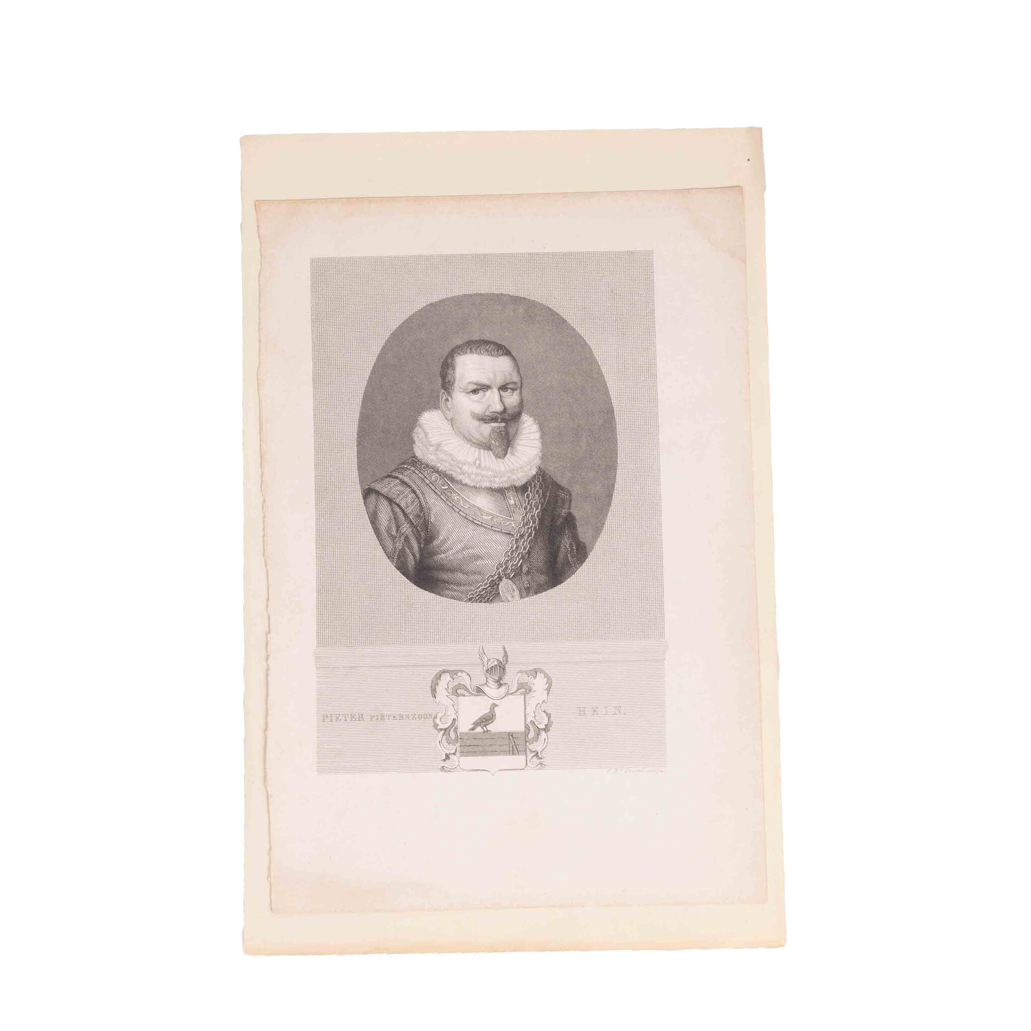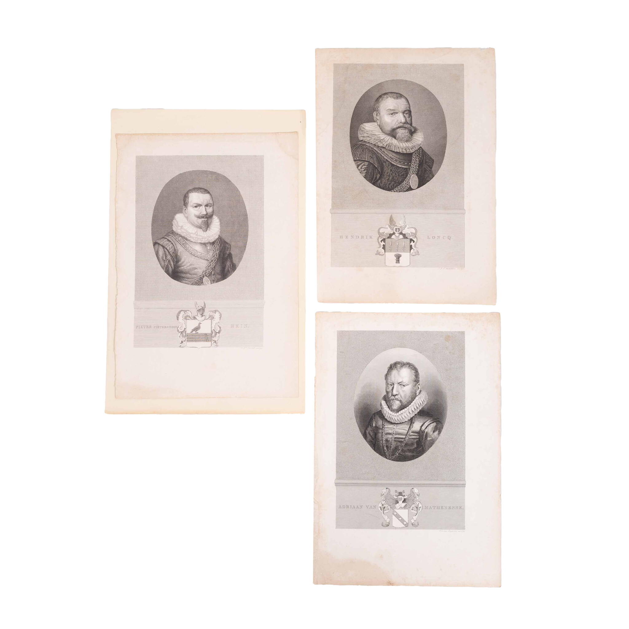 Prent 'Pieter Pieterszoon Hein' (Delfshaven, 25 november 1577 - 17 juni 1629, Nabij Oostende), door C.E. Taurel ; Prent 'Hendrik Loncq' (Roosendaal, 1568 - Amsterdam, 1634), door J.F.C. Reckleben; Prent 'Adriaan van Mathenesse' (ca 1508 - 1557), door C.L. van Kesteren. Staalgravures. De prenten hebben middenonder een wapen en zijn zwart-wit. Datering: ca. 1850. Conditie: De prenten vertonen sporen van ouderdom. Verkleuring, vlekken en kleine beschadigingen aan de randen. De prent van Hein is geplakt op een vel. Afmetingen beeldvlak prenten: ca. 21 x 13 cm.