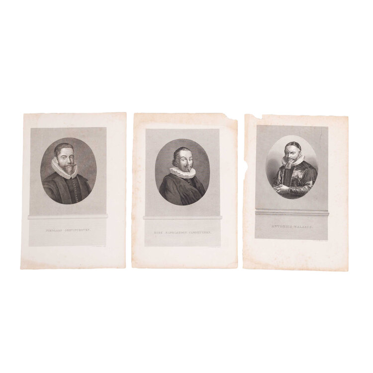 Prent 'Dirk Rafelszoon Camphuysen' (Gorinchem, 4 mei 1586 - Dokkum, 19 juli 1627), door J.F.C. Reckleben; Prent 'Nikolaas Grevinchoven' (Rotterdam, 1578 - Hamburg, Duitsland, mei 1632), door J.F.C. Reckleben; Prent 'Antonius Walaeus' (Gent, 3 oktober 1573 - Leiden, 9 juli 1639), door C.L. van Kesteren. Staalgravures. De prenten hebben middenonder een wapen en zijn zwart-wit. Datering: ca. 1850-1860. Conditie: De prenten vertonen sporen van ouderdom. Verkleuring, vlekken en beschadigingen aan de randen. Afmetingen beeldvlak prenten: ca. 21 x 13 cm.