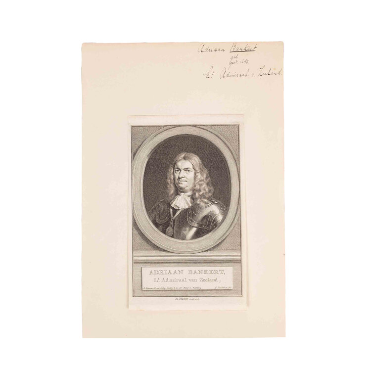 Prent 'Louis van Boisot' (Brussel, ca. 1530 - Oosterschelde, 27 mei 1576); Prent 'Jacob van Heemskerk' (Amsterdam, 13 maart 1567 - bij Gibraltar, 25 april 1607), Admiraal; Prent 'Adriaan Bankert' (vermoedelijk Vlissingen, ca. 1615-1620 - 22 april 1684), Luitenant Admiraal van Zeeland. Gravures van Jacob Houbraken. De prenten zijn zwart-wit. Datering: ca. 1740-1760. Conditie: De prenten vertonen sporen van ouderdom. Verkleuring, vlekken en kleine beschadigingen aan de randen. De prenten zijn geplakt op een vel. Afmetingen beeldvlak prenten: ca. 17 x 10 cm.
