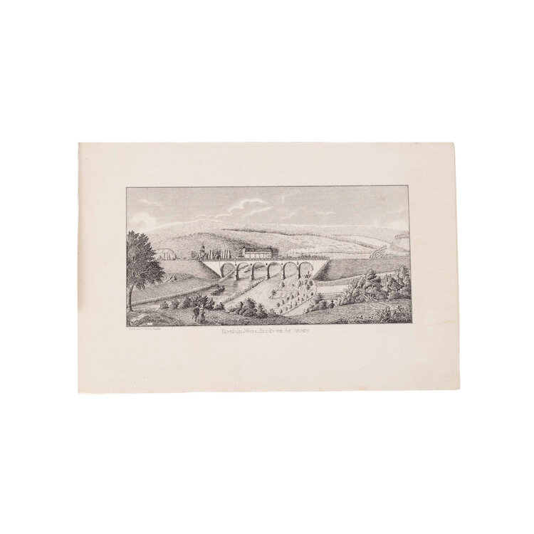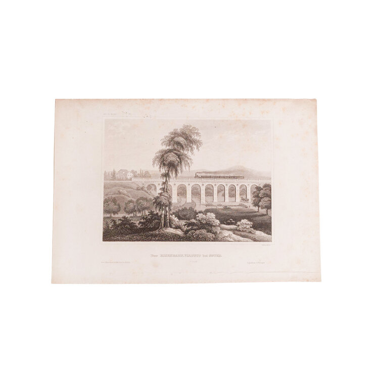 Drie prenten van een spoorwegbrug in Duitsland: 'Der Eisenbahn-viaduct bei Gotha', B. Metzeroth, Bibliographisches Institut. Ets en gravure. Datering: circa 1850; 'Der Göltzsch-Thal-viaduct', C.R., John Poppel. Ets en gravure. Datering: circa 1851; 'Eisenbahn-Werra-Brücke von der Ostseite', C.F. Röhrig. Ets en gravure. Datering: onbekend. Drie prenten met landschappen waar een stoomtrein een spoorwegviaduct oversteekt. Conditie: De prenten hebben sporen van ouderdom. Verkleuring, veel vlekken, kleine beschadigingen aan de randen en bij beide prenten onderaan een horizontale vouw. Afmetingen van papier prenten: ca. 16,5 x 24 cm.