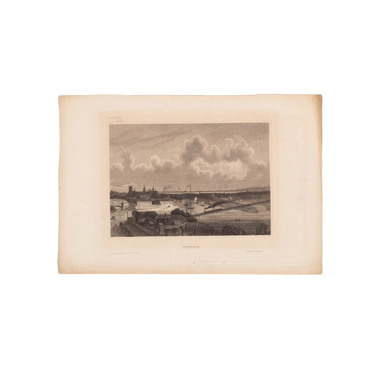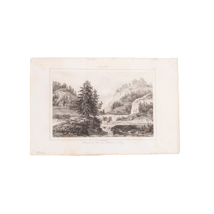 Drie prenten van spoorbruggen in Polen en Oostenrijk: 'Stettin', uitgever Bibliographisches Institut, Hildburghausen. Ets en gravure van de stad Settin (Szczecin) in Polen. Met de opening van de spoorlijn Stettin-Berlijn en de uitbreiding van de haven ontwikkelde de stad Stettin zich tot een belangrijke industriële locatie. Datering: circa 1850; 'Die Eisenbahn über den Semmering' (Oesterreich), uitgever Bibliographisches Institut, Hildburghausen. Ets en gravure van een spoorwegbrug van de Semmeringspoorlijn in Oostenrijk. Deze loopt van Gloggnitz in Neder-Oostenrijk over de Semmering naar Mürzzuschlag in Stiermarken en is geopend in 1854. Een project van ingenieur Carl von Ghega. Het staat sinds 1998 op de werelderfgoedlijst van UNESCO. Datering onbekend; 'Chemin de Fer entre Budweis et Linz' (Autriche) door Lemaître. Ets en gravure van een brug tussen Budweis en Linz. De paardenspoorlijn Budweis - Linz - Gmunden, geopend tussen 1827 en 1836, werd voornamelijk gebruikt om zout van de regio Opper-Oostenrijk, het Salzkammergut, naar Bohemen te transporteren. Datering: tussen 1842 en 1850. Conditie: De prenten hebben sporen van ouderdom, zoals vlekken en verkleuring. Kleine vouwtjes en beschadigingen aan de randen. Afmetingen van papier 'Stettin' en 'Die Eisenbahn über den Semmering': ca. 16,5 x 25 cm; Afmetingen van papier 'Chemin de Fer entre Budweis et Linz': ca. 14 x 21,5 cm.