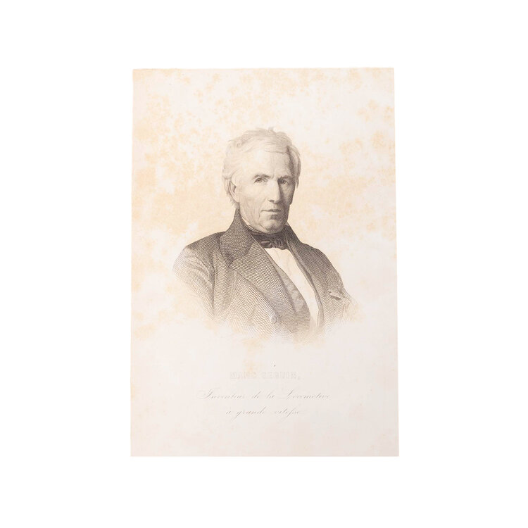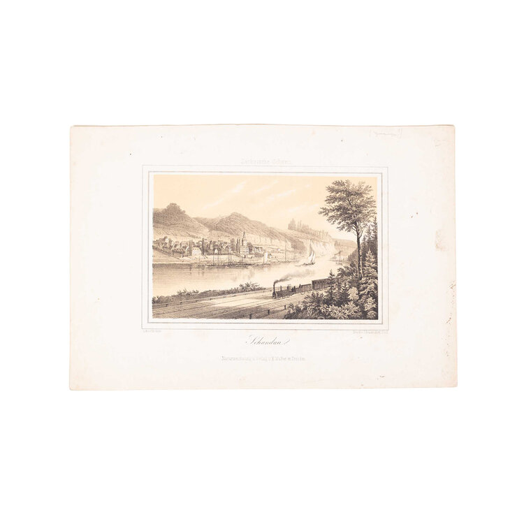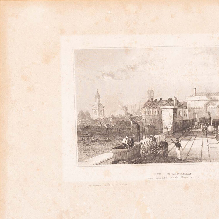 Drie prenten met een treinthema: 'Marc Séguin. Inventeur de la Locomotive à grande vitesse'. Staalgravure door L. Melois van Marc Seguin (1786 - 1875), een Franse ingenieur. Hij vond in 1824 samen met zijn broer Camille (1793-1852) de hangbrug uit en hij ontwierp de eerste spoortunnels in Frankrijk. Datering: eind 19e eeuw; 'Die Eisenbahn von London nach Greenwich', Bibliographisches Institut, Hildburghausen. Gravure en ets van het gezicht op de spoorweg van Londen naar Greenwich, met Greenwich op de achtergrond. Datering: ca. 1840; Sächs Schweiz. 'Schandau'. Litho van C.W. Arldt, druk van J. Braunsdorf, uitgegeven door E. Müller in Dresden. Zicht op de Saksisch-Boheemse Spoorweg, Sächsisch-Böhmische Staatseisenbahn. Datering: circa 1850. Conditie: De prenten hebben sporen van ouderdom. Verkleuring, veel vlekken en kleine beschadigingen aan de randen. Afmetingen van papier prenten: ca. 17 x 12 cm; 19 x 28 cm; ca. 20 x 29 cm.