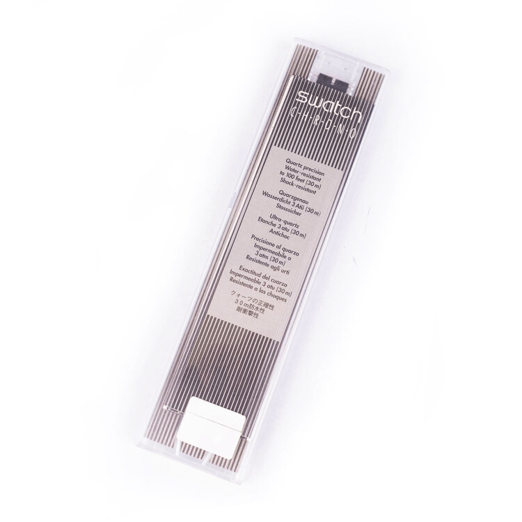 Set van drie Swatches, ca. 1993. Drie chrono watches. Met kunststof polsbandje. Donkerblauw met streepjes met uurwerk met witte, rode en donker blauwe details. Horloge met zwart kunstof bandje met ruit details, met uurwerk met zilveren en lichtblauwe details. Conditie: Het horloges bevinden zich niet in originele verpakking en het polsbandje kan verzwakt zijn door verstrijken van de tijd. Afmetingen: Verpakking 24,5 x 6 x 2 cm.
