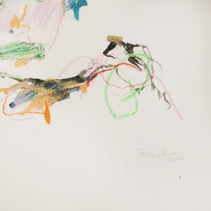 Tilleke Hulshof - Schwarz, Kinderen, 1988. Gemengde techniek op papier in metalen lijst. Kleurrijke lijntekening van twee kinderen. Signatuur en jaar rechtsonder. Conditie: gebruikssporen aan lijst, rechtsonder een barst in het glas. Afmeting lijst: 100 x 70 cm.