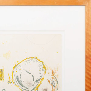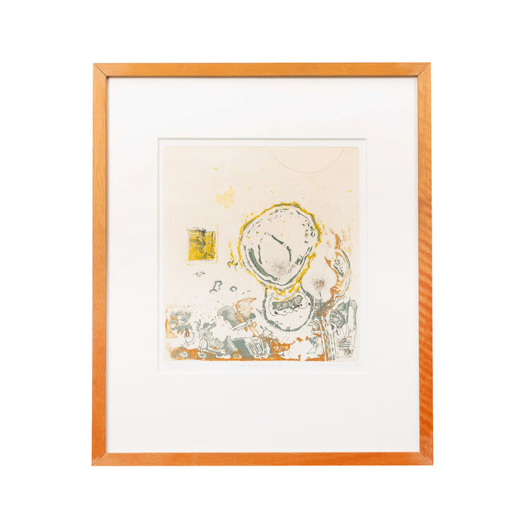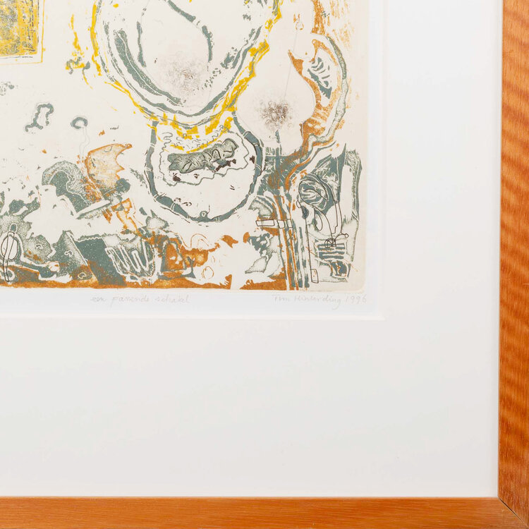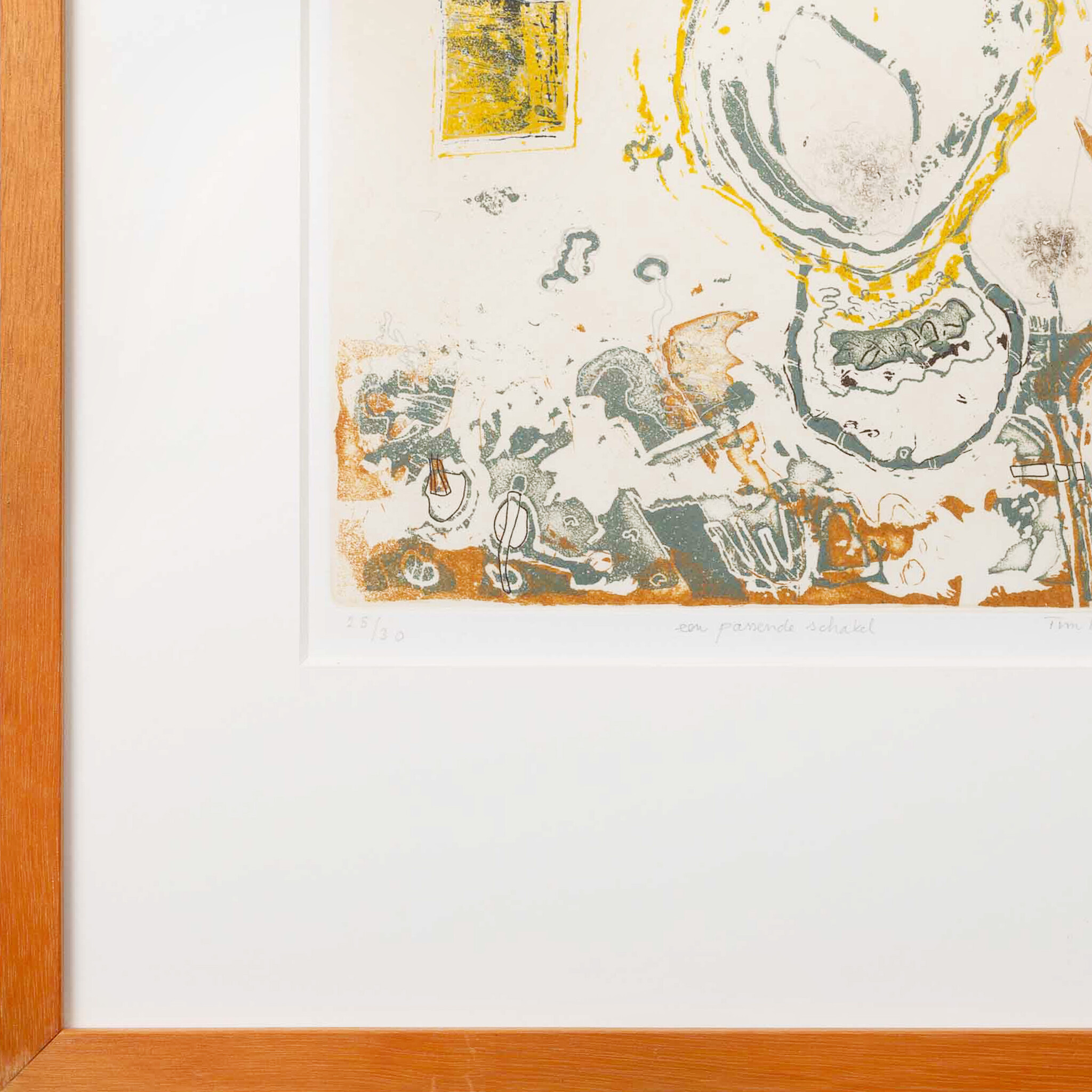Tim Hinterding (Kethel (Schiedam), 1952), 'Een passende schakel', 1996. Ets/aquatint in houten lijst, oplage: 25/30. Abstracte compositie in grijs, bruin en geel. Signatuur rechtsonder. Conditie: goed, lijst toont hooguit wat gebruikssporen. Afmeting lijst: 37 x 31 cm, beeldvlak: 20 x 18 cm.
