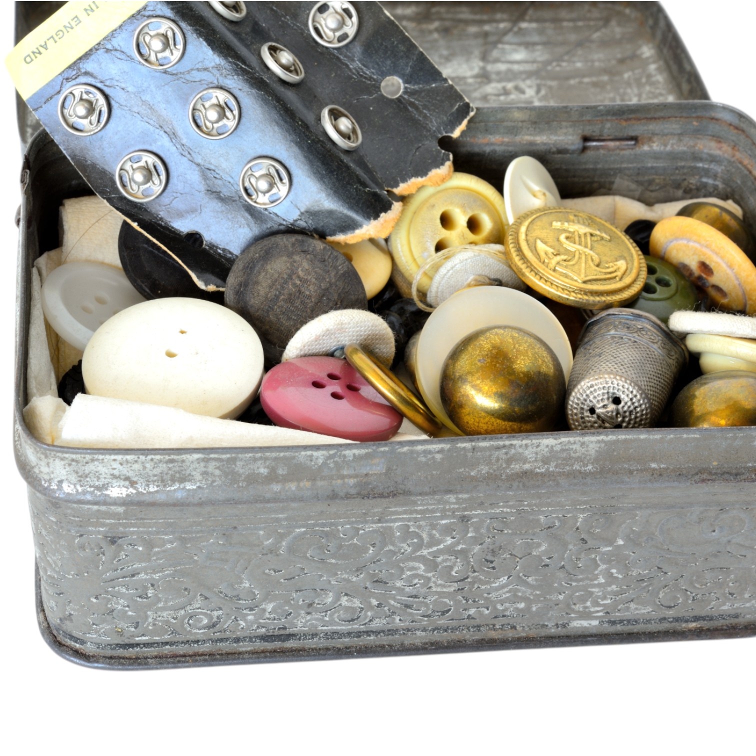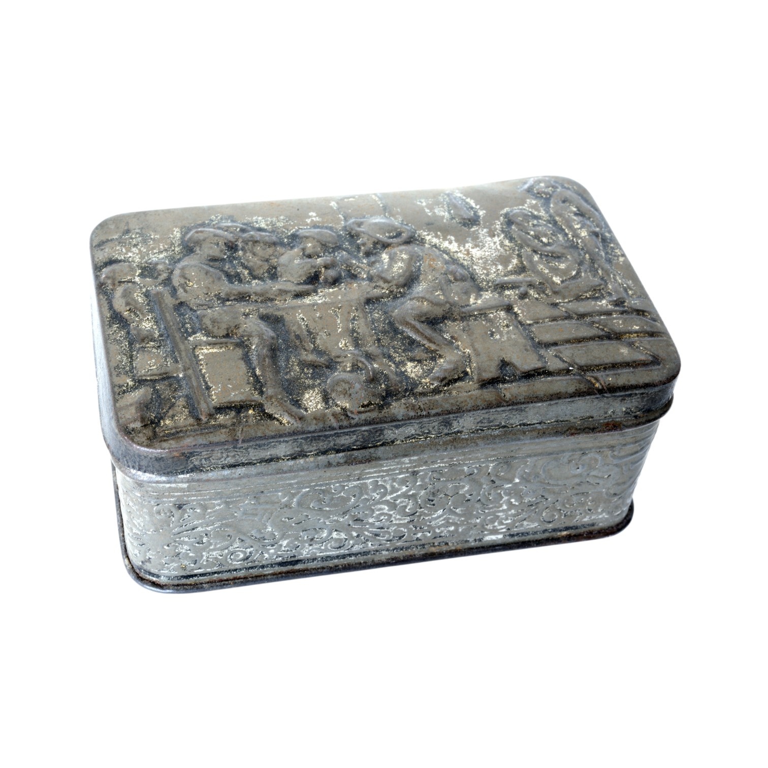 Een blikken doos met een reliëf voorstelling van het interieur met gezelschap van een herberg. Het blikje bevat oa diverse knopen en een vingerhoedje. Datering: 20ste eeuw. Conditie: Goed met een aantal slijtageplekken. Afmetingen: ca. 5 cm hoog, 7 cm breed, 12 cm diep.