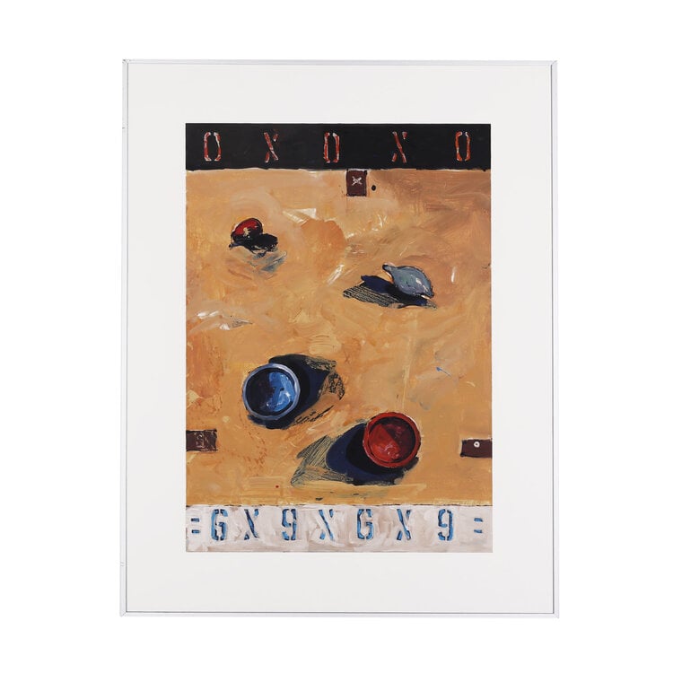 Toon Kuijpers, Field 10, jaartal onbekend. Gouache op papier in metalen lijst. Abstracte compositie van kleurrijke objecten voor een gele achtergrond. Bovenin een zwarte balk met 'O X O X O' en onderin een balk met '= 6 X 9 X 6 X 9 ='. Conditie: goed, gebruikssporen aan lijst. Afmeting lijst: 90 x 70 cm.