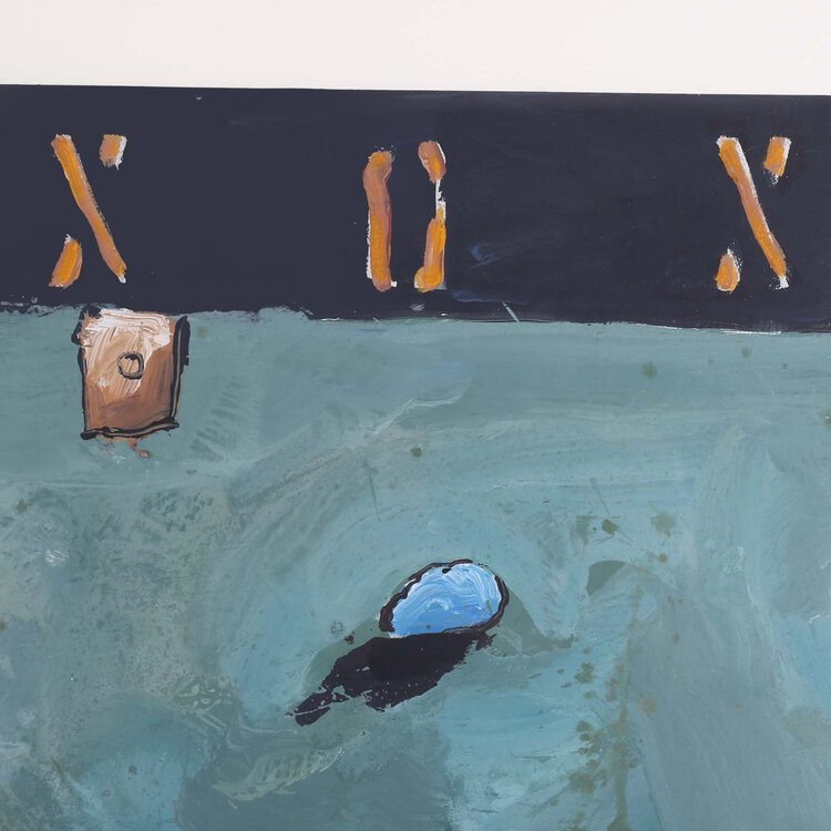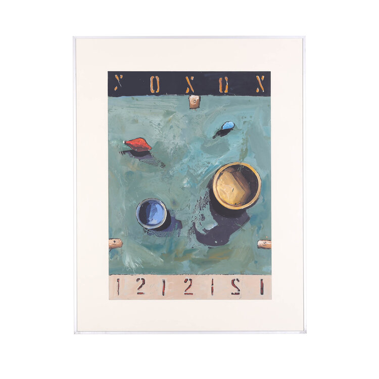 Toon Kuijpers, Field 11, jaartal onbekend. Gouache op papier in metalen lijst. Abstracte compositie van kleurrijke objecten voor een groene achtergrond. Bovenin een zwarte balk met 'X O X O X' en onderin een balk met '1 2 1 2 1 2 1'. Conditie: goed, gebruikssporen aan lijst. Afmeting werk: 70 x 50 cm, lijst: 90 x 70 cm.