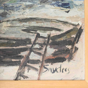 Toon Snijders, Bootje op strand, jaartal onbekend. Olieverf op paneel in houten lijst. Schildering van een bootje op een strand met op de achtergrond gebouwen. Rechtsonder signatuur. Conditie: gebruikssporen en vlekjes op de lijst. Afmeting werk zonder lijst: 40 x 59 cm, incl. lijst 44 x 63,5 cm.