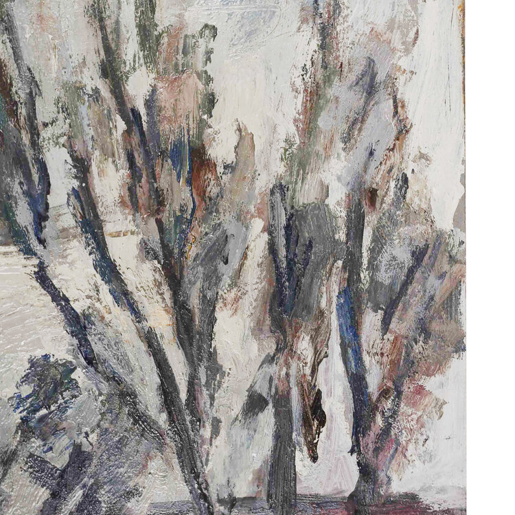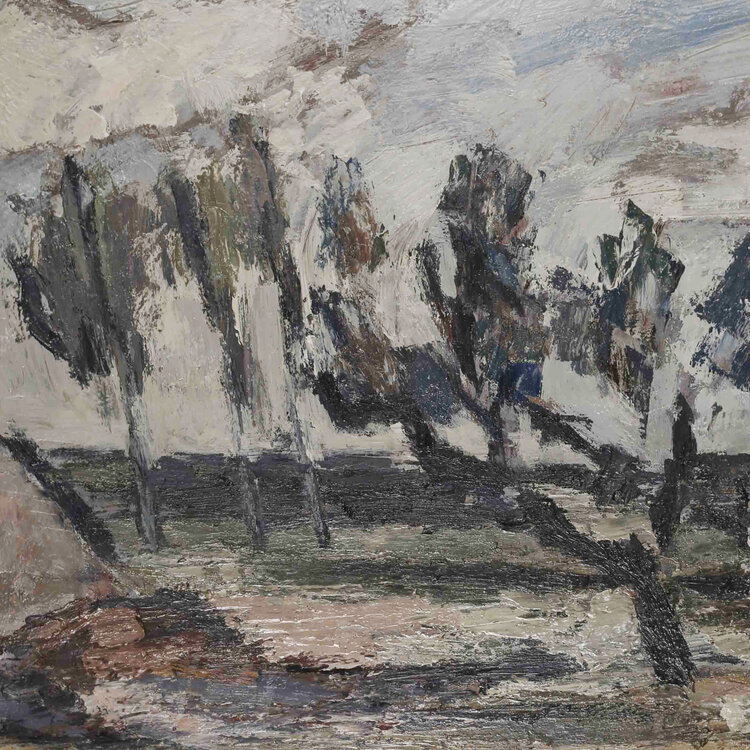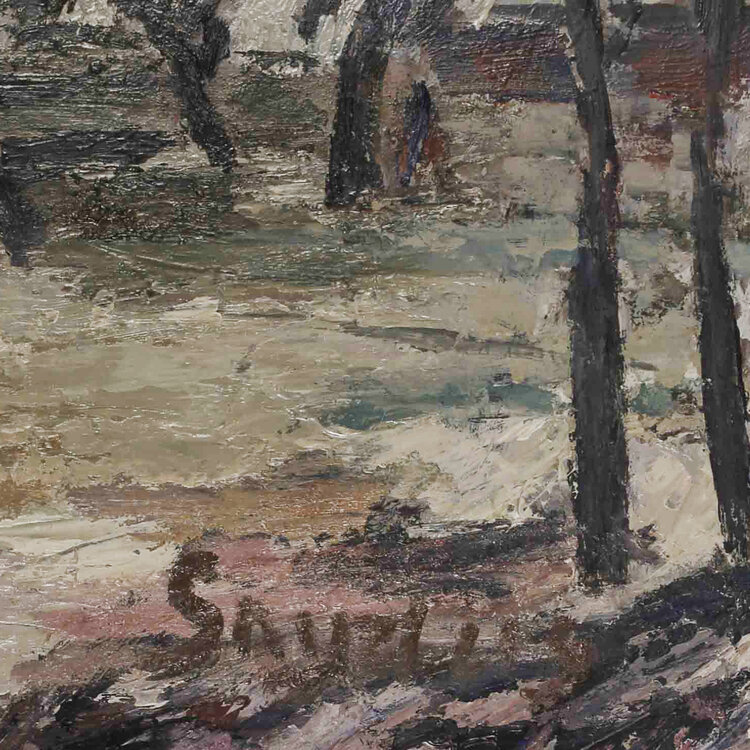 Toon Snijders, Boomgaard, jaartal onbekend. Olieverf op paneel. Landschap met bomen in grove penseelstreken. Rechtsonder signatuur. Conditie: gebruikssporen aan de randen. Afmeting: 40 x 65 cm.