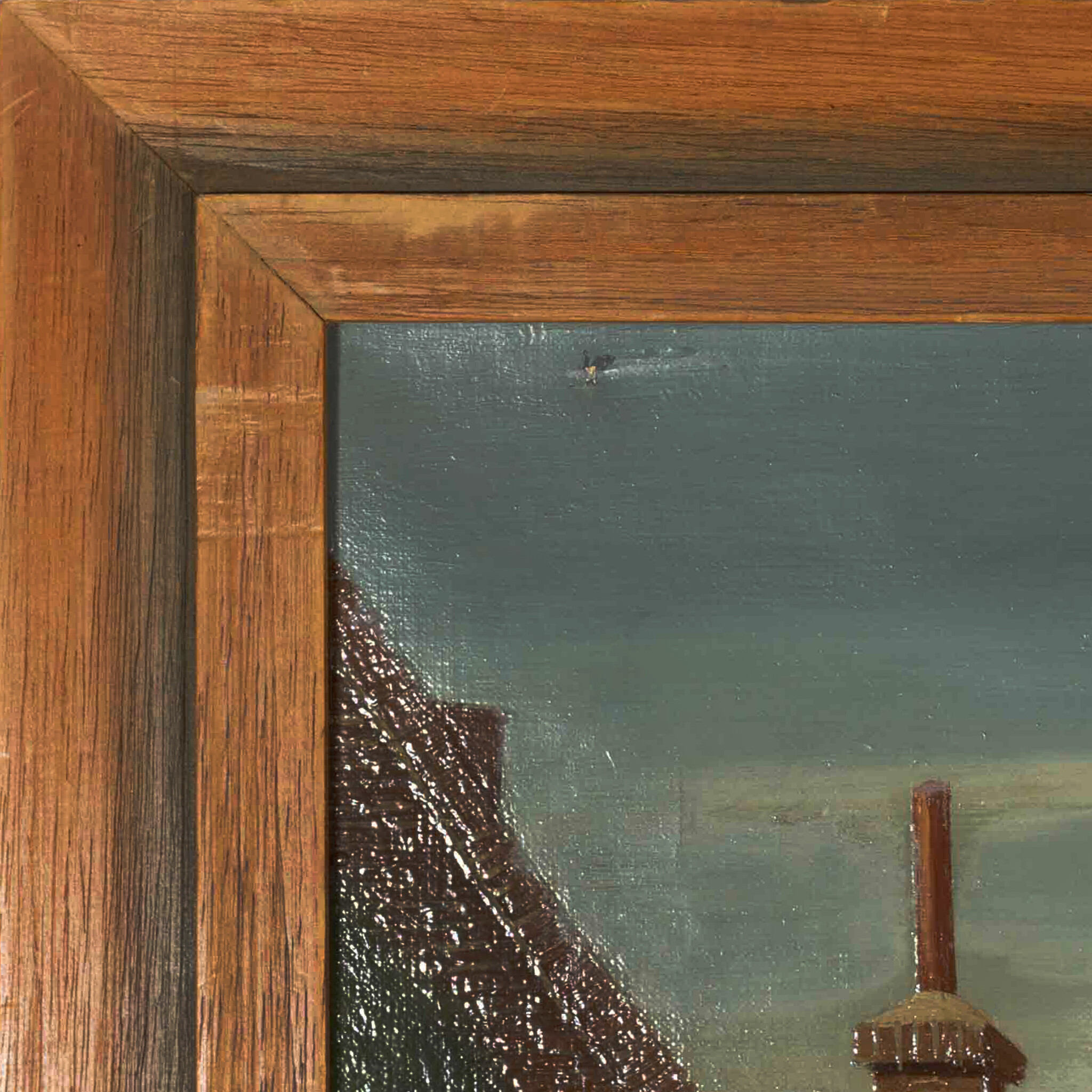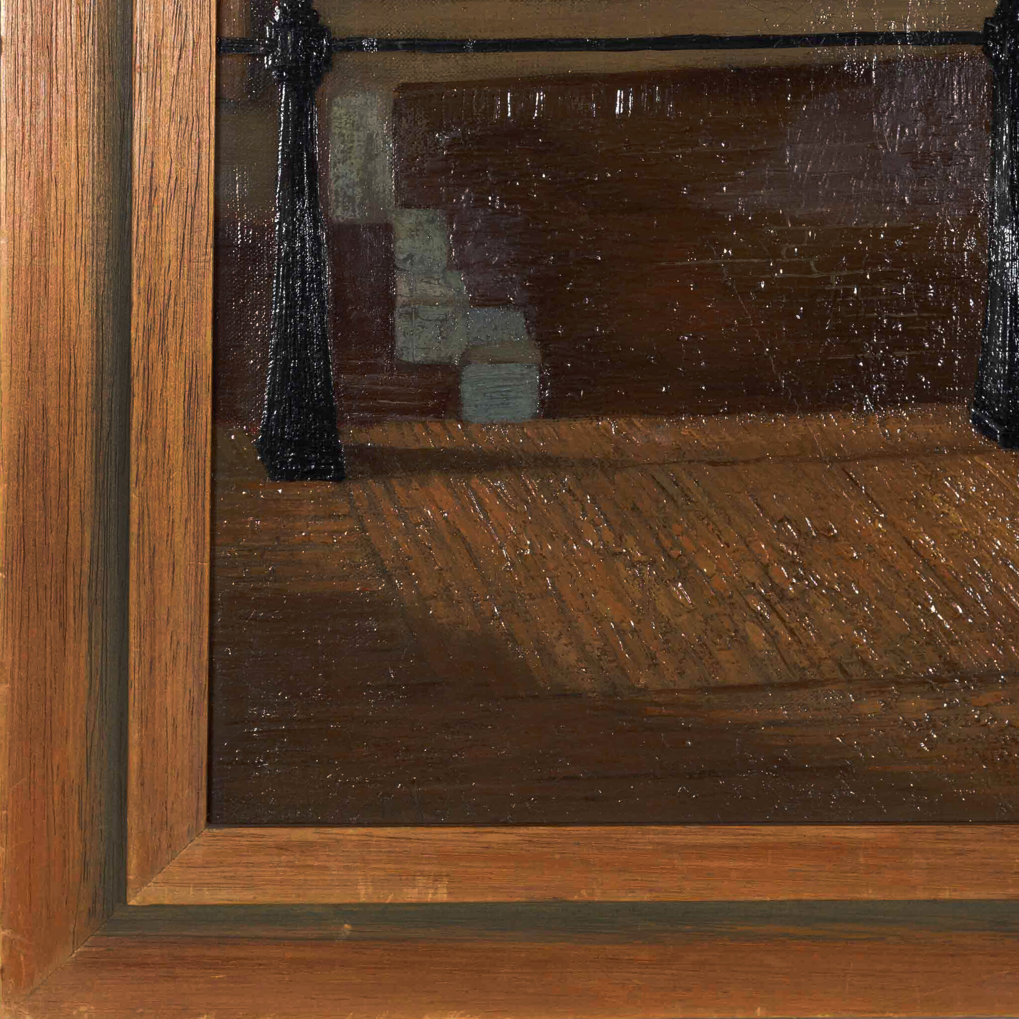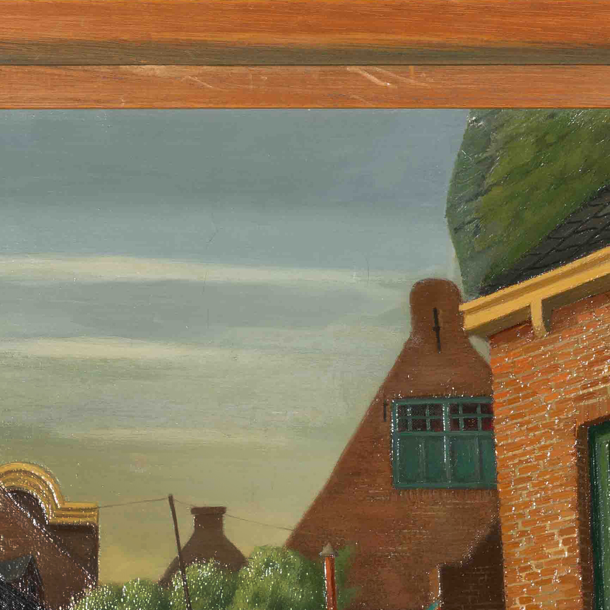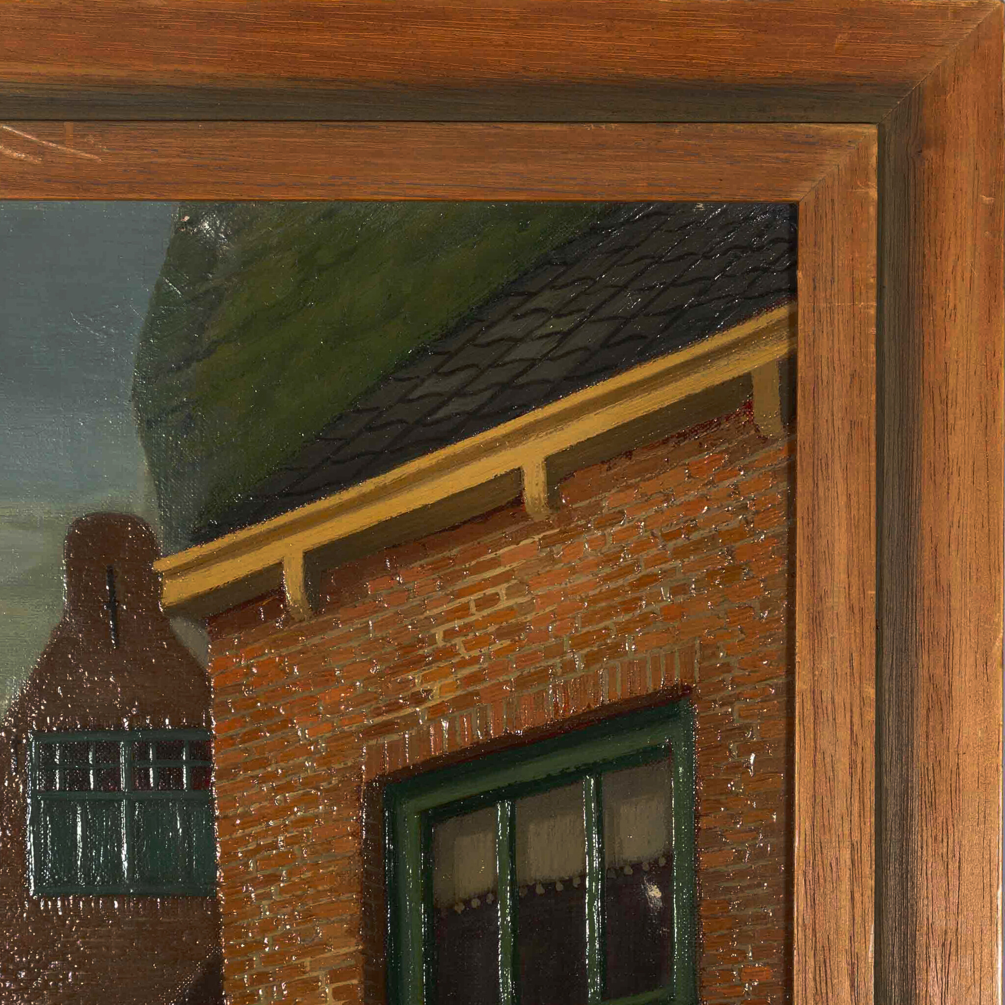Toon van den Muysenberg (1901-1967), 'Straatje', 1937. Olieverf op doek in houten lijst. Gezicht op huizen met hek in bruin en groen. Signatuur rechtsonder. Van den Muysenberg heeft deelgenomen aan kunstenaarsvereniging 'De Onafhankelijken'. Het Belasting & Douane Museum heeft ook een werk van deze kunstenaar in de collectie. Conditie: beschadiging verf rechterkant, krassen op lijst. Afmetingen incl lijst: ca 69 x 58 cm.