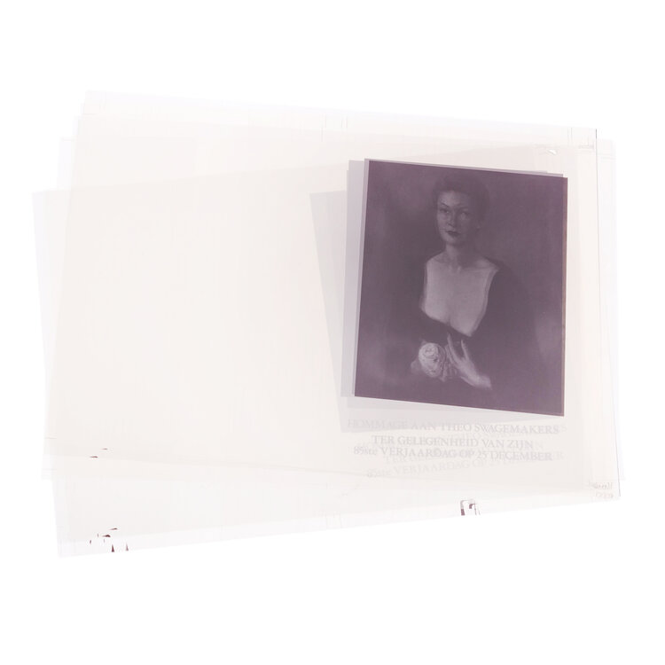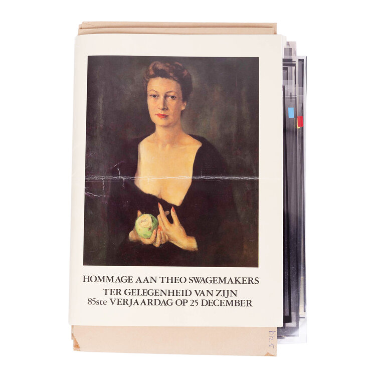 Hommage aan Theo Swagemakers, Ter gelegenheid van zijn 85e verjaardag op 25 december 1983. Een brochure met afbeeldingen in kleur en zwart-wit van werken van de kunstenaar, verschenen ter gelegenheid van de tentoonstelling Hommage aan Theo Swagemakers in het Singer Museum te Laren bij de opening op 17 december 1983. Bijgevoegd negatieven in zwart-wit of vier kleuren van de afbeeldingen. Conditie: Vouw in het midden van de brochure. De negatieven zijn in goede staat. Afmeting brochure: 28 x 20 cm.