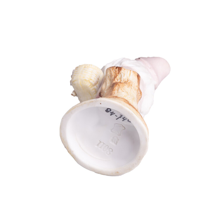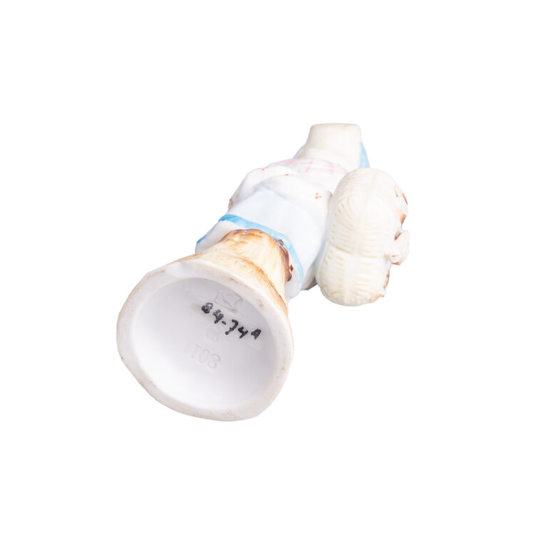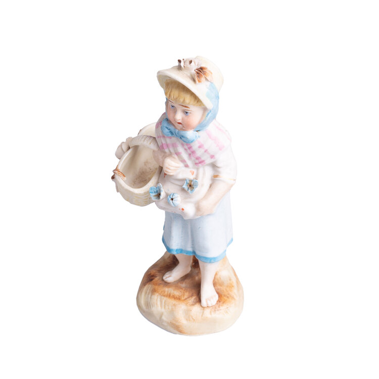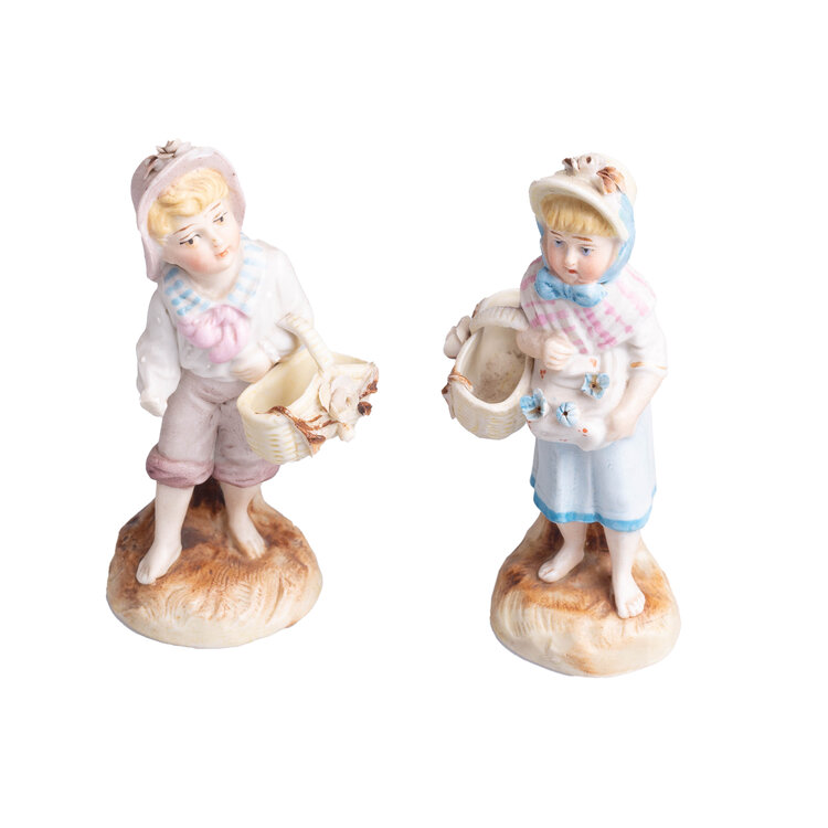 Twee beeldjes van biscuitporselein: meisje met in rechterhand een mandje, met de hand gekleurd in de kleuren blauw-rose. Hoedje voorzien van bruine roos en blauw strikbandje, voetje bruin. En jongetje met in linkerhand een mandje, hoedje voorzien van een roos. Rose strik, wit jasje met blauwgestreepte kraag en lila kuitbroek. Datering: onbekend. Conditie: Rechterarm jongen is afgebroken, beschadigingen aan hoed. Afmetingen: ca. 10 x 5 x 5 cm.