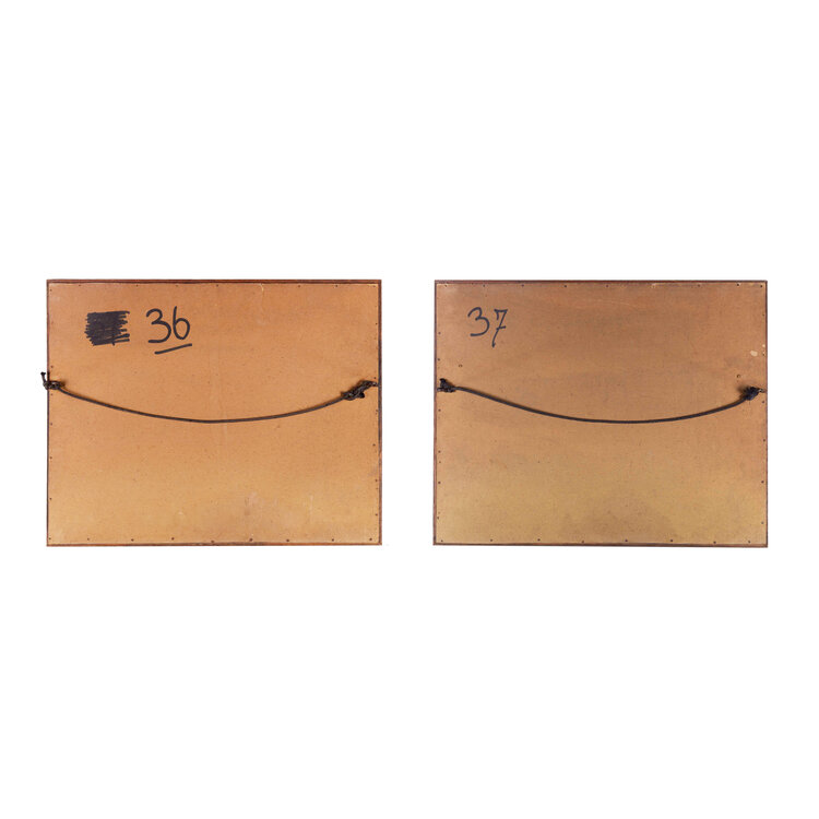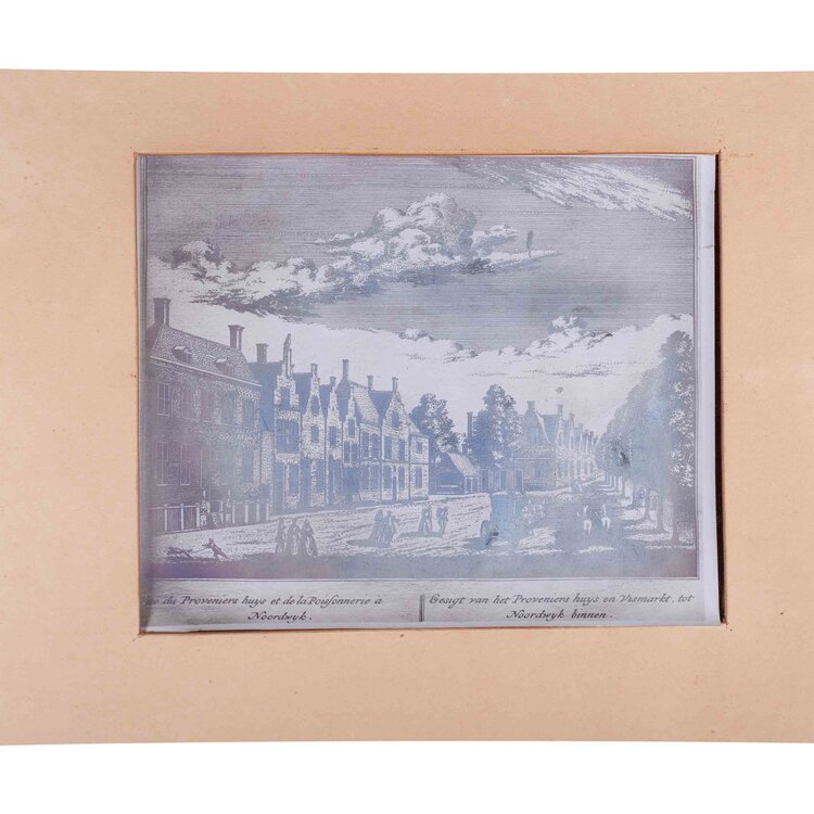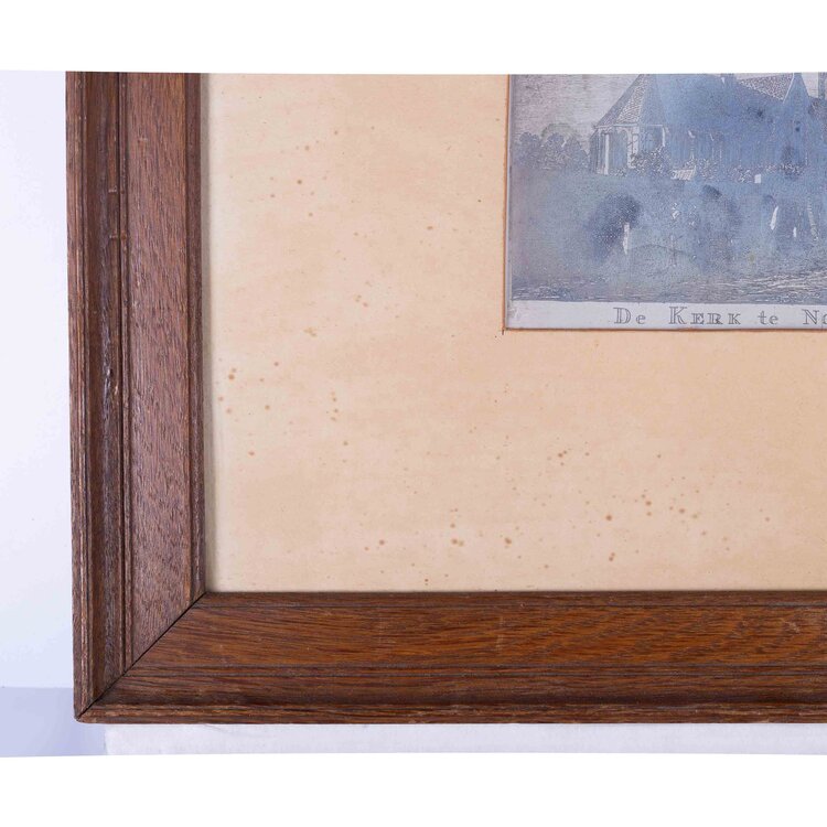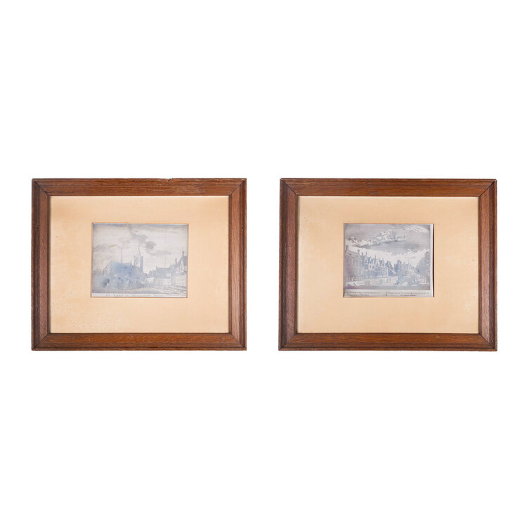 Twee facsimile afdrukken van etsen met historische zichten op Noordwijk. 'De Kerk te Noordwijk Binne' door Hendrik Spilman en 'Gesigt van het Proveniers huys en Vismarkt, tot Noordwyk binnen', door onbekende kunstenaar. Beide zijn ingelijst in houten lijst met passe-partout. Datering: onbekend. Conditie: vlekjes op de passe-partouts en de lijsten tonen gebruikssporen; een lijst heeft bovenin een beschadiging. Afmeting per lijst: 39 x 48 cm.
