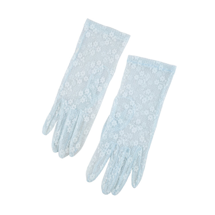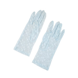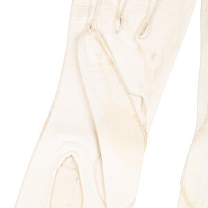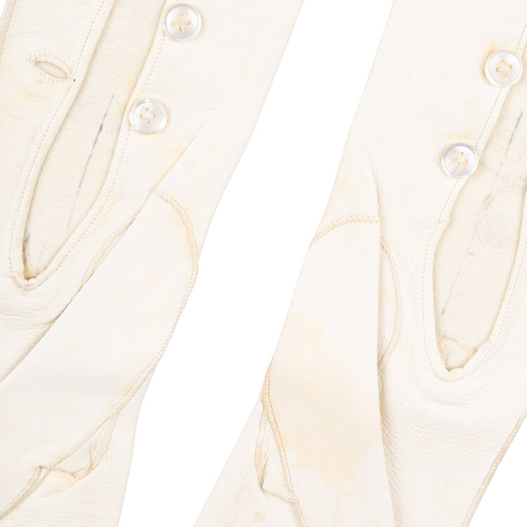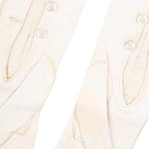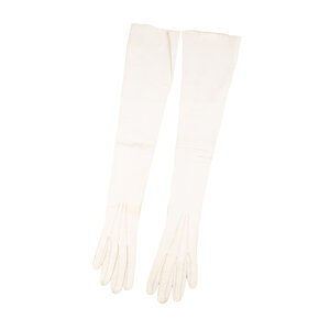 Twee paar handschoenen, 20ste eeuw. Een paar crèmekleurige avondhandschoenen van leer, maat 6. Een paar blauwe kanten handschoenen. Conditie: de crèmekleurige handschoenen vertonen gebruikssporen, verkleuring; de blauwe handschoenen zijn in goede staat. Afmetingen crèmekleurige handschoenen: ca. 49 x 8 cm. Afmetingen blauwe handschoenen: ca. 24 x 8 cm.