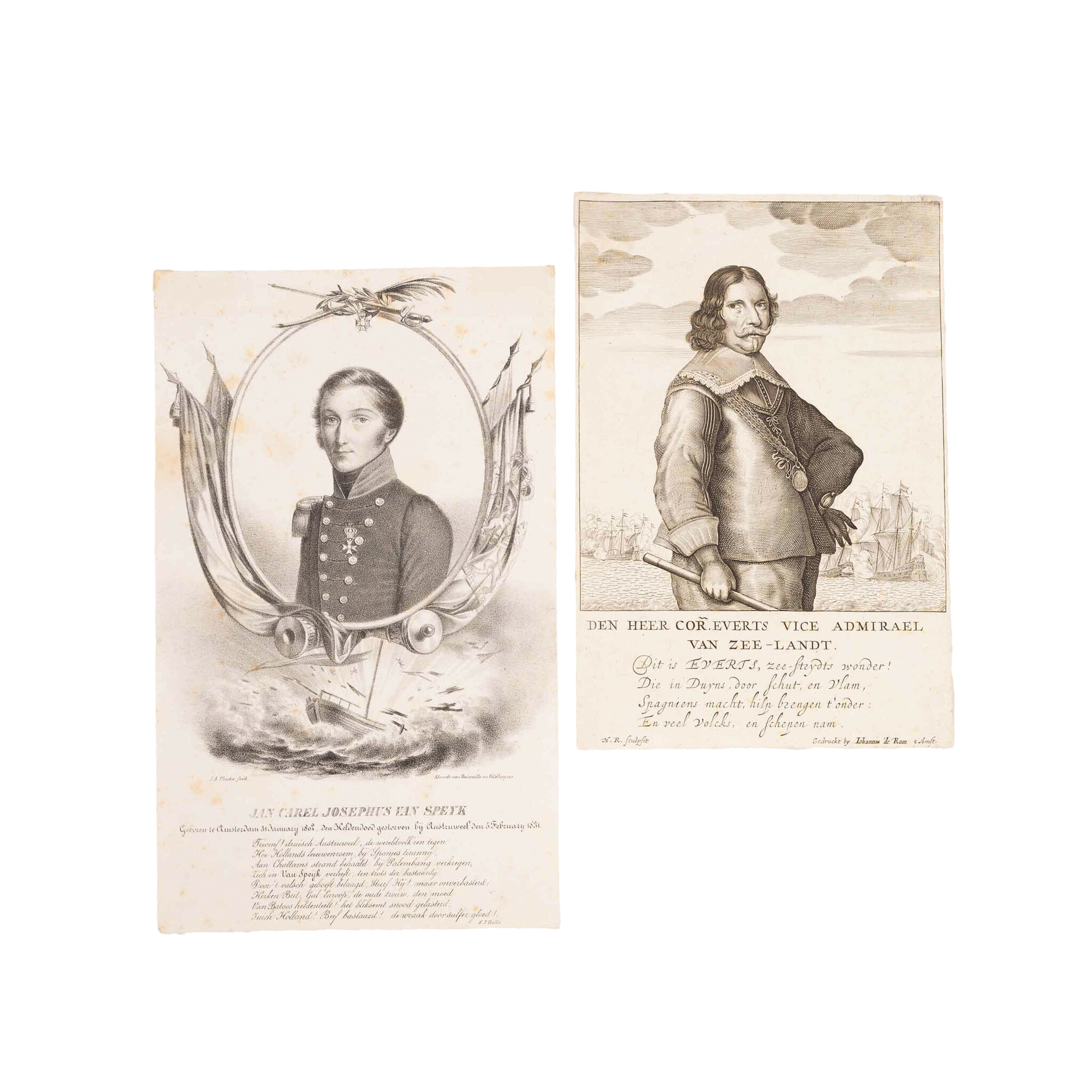 Prent 'Den Heer Cor. Everts vice admirael van Zee-landt'. Gravure, drukker Johannes de Ram; Prent 'Jan Carel Josephus van Speyk'. Litho, drukker Daiwaille en Veldhuijzen. De prenten zijn zwart-wit en onder het portret staat een vers. Datering: onbekend. Conditie: De prenten vertonen sporen van ouderdom. Verkleuring, vlekken en kleine beschadigingen aan de randen. Afmetingen papier prenten: ca. 24,5 x 16,5 cm; 29 x 17,5 cm.