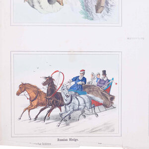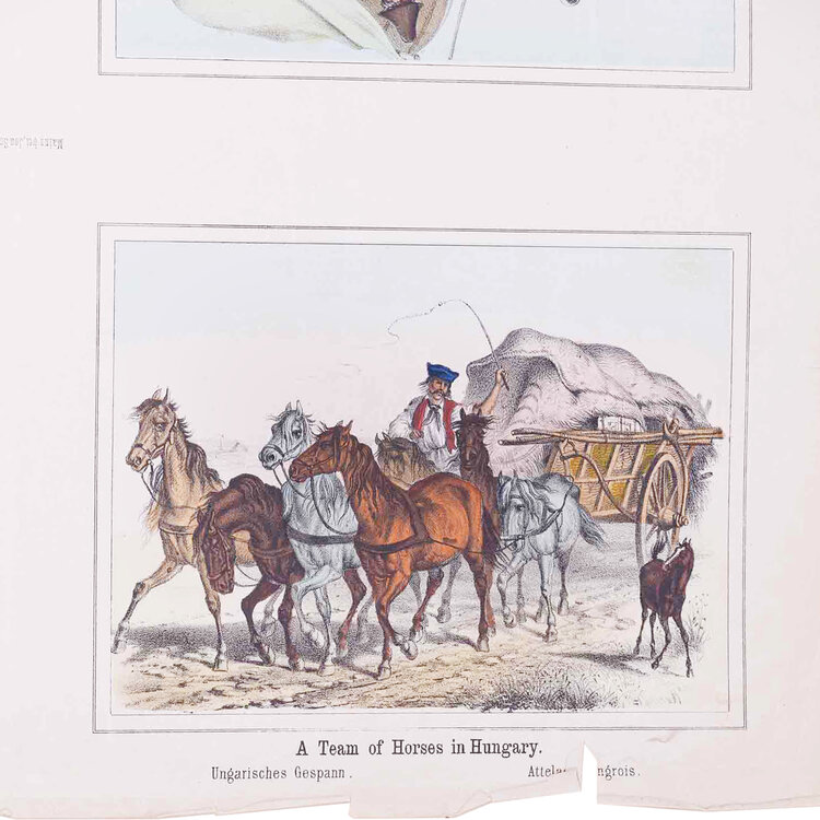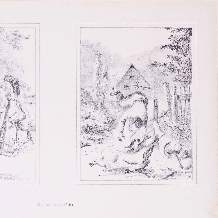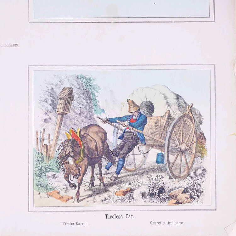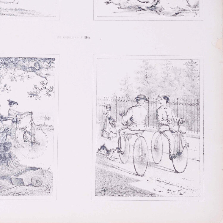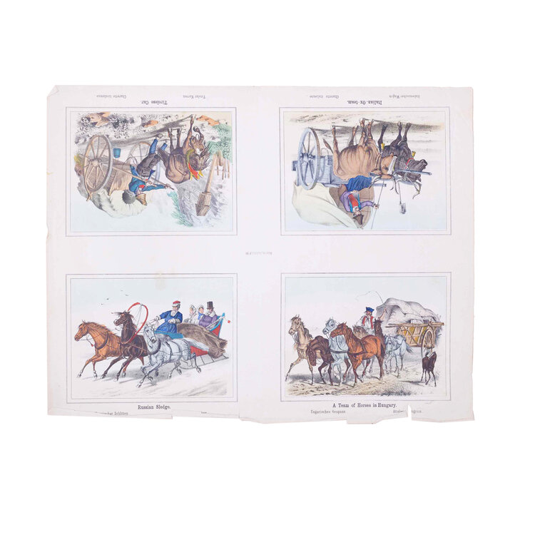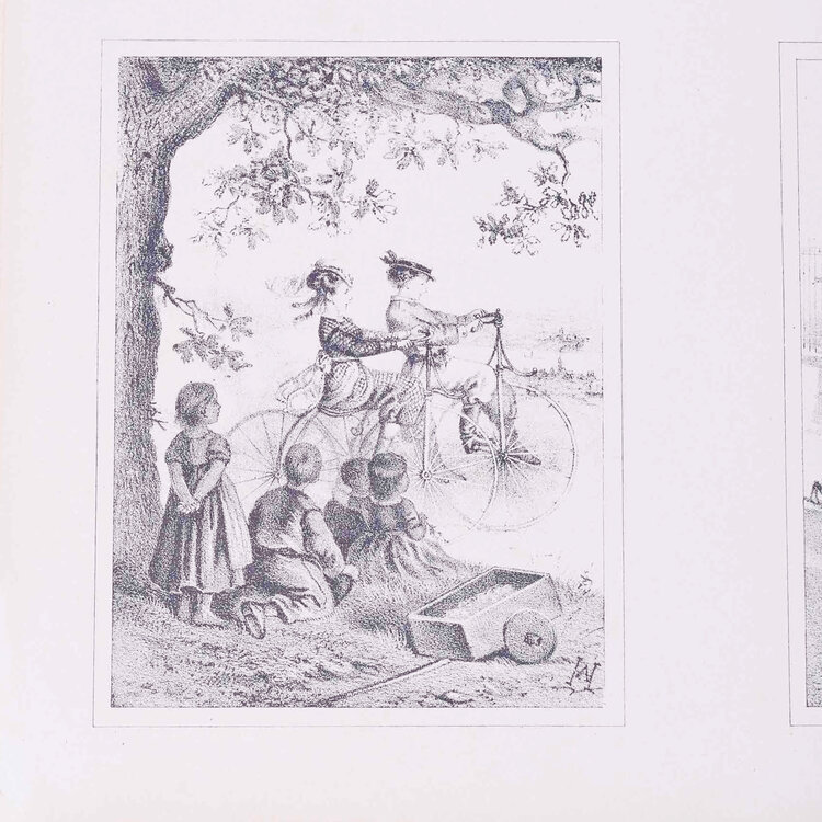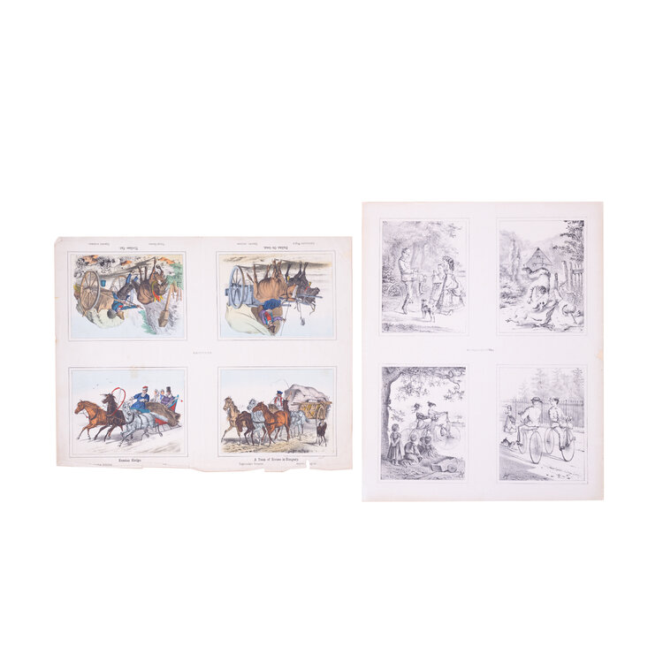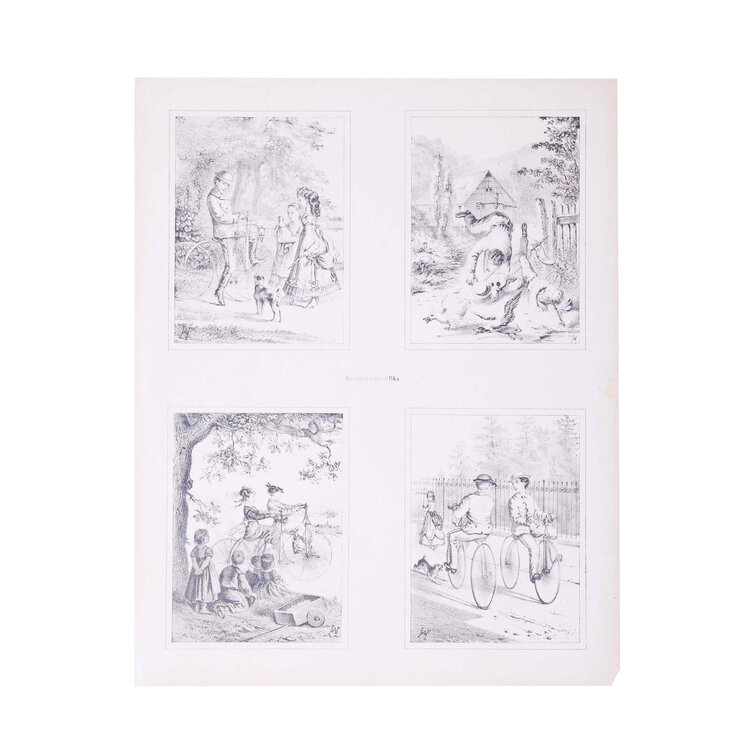 Twee prenten met vier 19e eeuwse scenes. Gepubliceerd door Joseph Scholz, Mainz, Duitsland. Een handgekleurde litho met 'Vier scenes met voortgetrokken rijtuigen' en een zwart-wit litho met 'Vier scenes met mensen op een fiets'. Datering: circa 1870. Conditie: De prenten hebben sporen van ouderdom. Verkleuring, vlekken, vouwen en beschadigingen vnl aan de randen. De scenes met rijtuigen heeft aan de bovenkant scheuren en vouwen. Afmetingen van papier prenten: 35 x 43 cm.