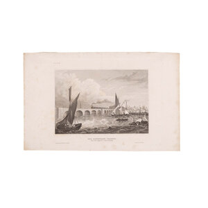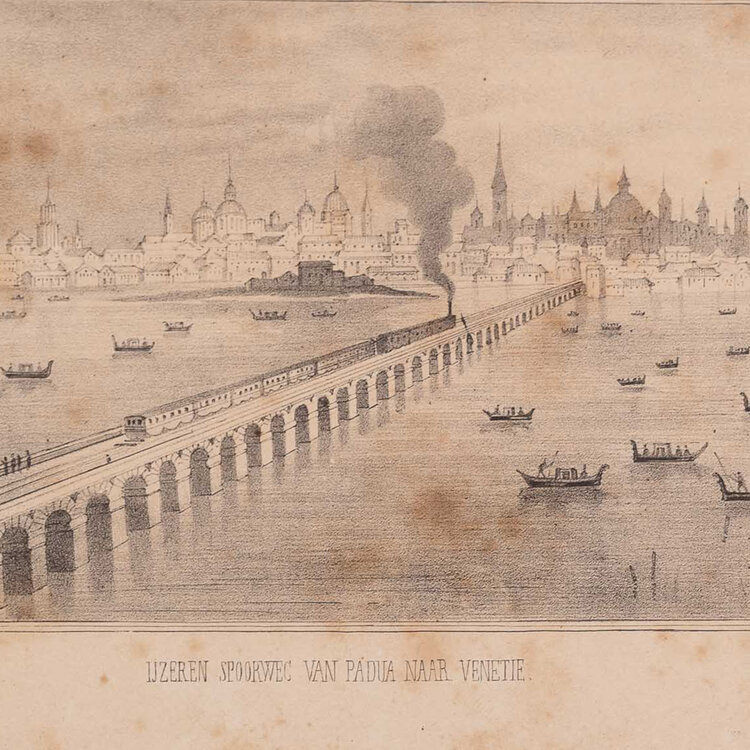 Twee prenten van een spoorwegbrug in Venetië: 'IJzeren spoorweg van Padua naar Venetie', litho; 'Der Eisenbahn-viaduct über die Lagunen nach Venedig', ets en gravure, datering: circa 1847. Uitgever: Bibliographisches Institut, Hildburghausen. Beide prenten hebben een afbeelding van het zicht op een trein rijdend op een spoorwegviaduct over de lagunes naar Venetië, met boten op de voorgrond en Venetië in de verte. Conditie: De prenten hebben sporen van ouderdom, zoals vlekken en verkleuring. Kleine beschadigingen aan de randen. Afmetingen papier 'IJzeren spoorweg van Padua naar Venetie': ca. 15,5 x 20 cm. Afmetingen papier 'Der Eisenbahn-viaduct über die Lagunen nach Venedig': ca. 15,5 x 25 cm.