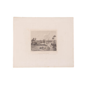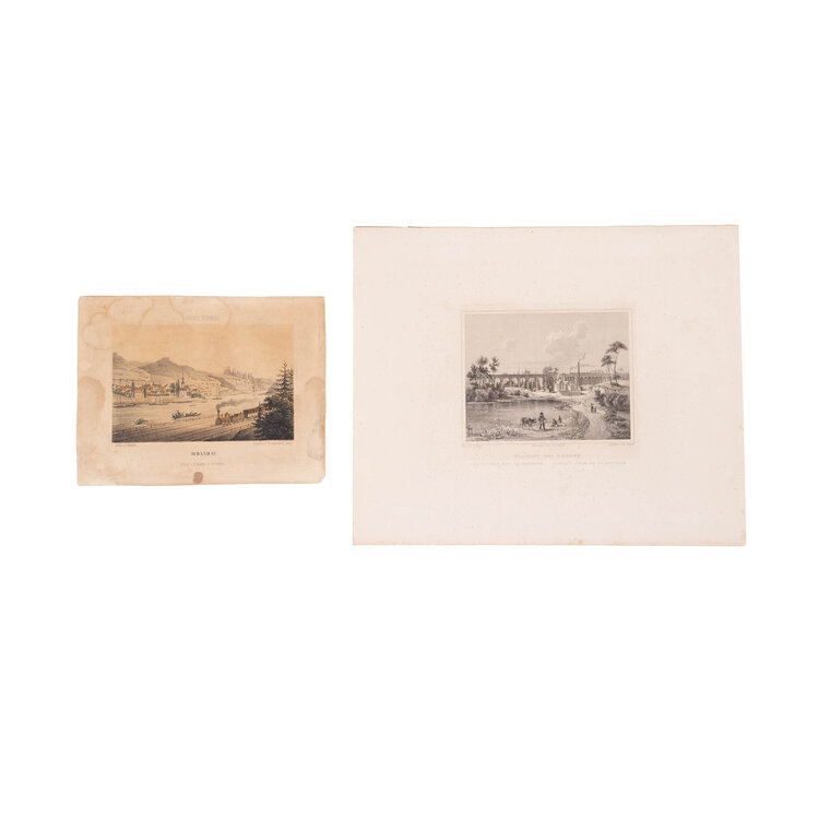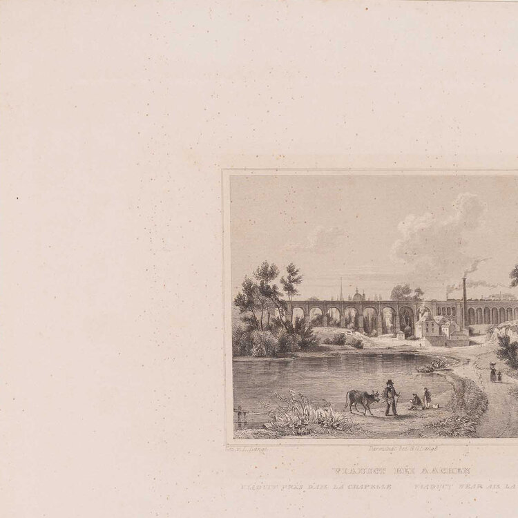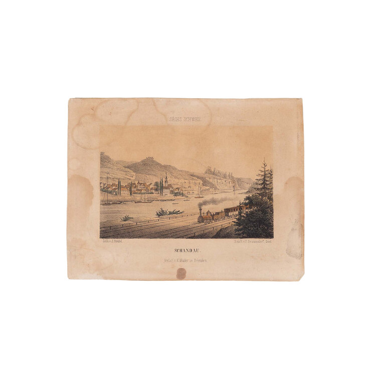 Twee prenten van Duitsland: 'Viaduct bei Aachen. Viaduct pres d'Aix la Chapelle/ Viaduct near Aix la Chapelle'. Staalgravure van Joh. Poppel naar een ontwerp van L. Lange, uitgegeven door G.G. Lange in Darmstadt. Viaduct met de spoorlijn en uitzicht op Burtscheid. Datering: circa 1840; Sächs Schweiz. 'Schandau'. Litho van J. Redel, druk van J. Braunsdorf, uitgegeven door E. Müller in Dresden. Zicht op de Saksisch-Boheemse Spoorweg, Sächsisch-Böhmische Staatseisenbahn. Datering: circa 1850. Conditie: De prenten hebben sporen van ouderdom. Verkleuring, veel vlekken en kleine beschadigingen aan de randen. Afmetingen van papier prenten: ca. 12 x 16 cm; ca. 20 x 24 cm.