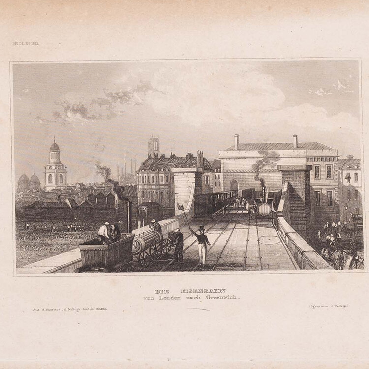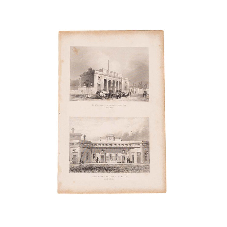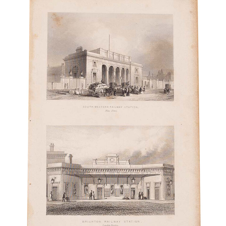 Twee prenten van Groot-Brittannië: 'Die Eisenbahn von London nach Greenwich', Bibliographisches Institut, Hildburghausen. Gravure en ets van het gezicht op de spoorweg van Londen naar Greenwich, met Greenwich op de achtergrond. Datering: ca. 1840; 'South Western Railway Station', Nine Elms. 'Brighton Railway Station', London Bridge. Ets en gravure van twee treinstations. Datering: ca. 1845. Conditie: De prenten hebben sporen van ouderdom. Verkleuring, vlekken en kleine beschadigingen aan de randen. Afmetingen van papier prenten: ca. 17 x 24,5 cm; ca. 18 x 11,5 cm.