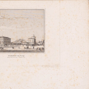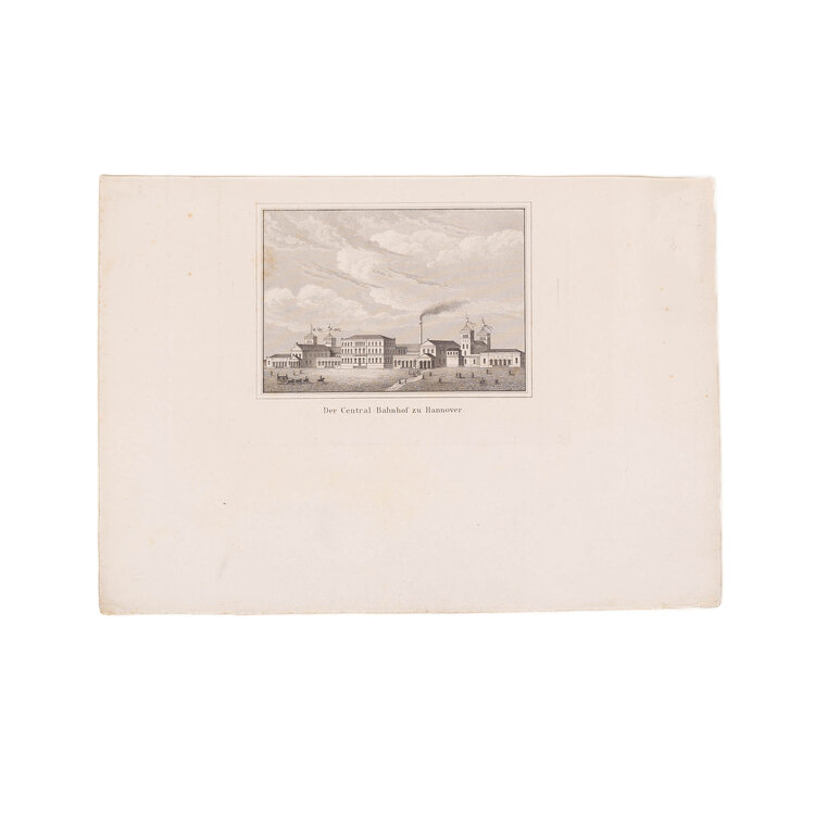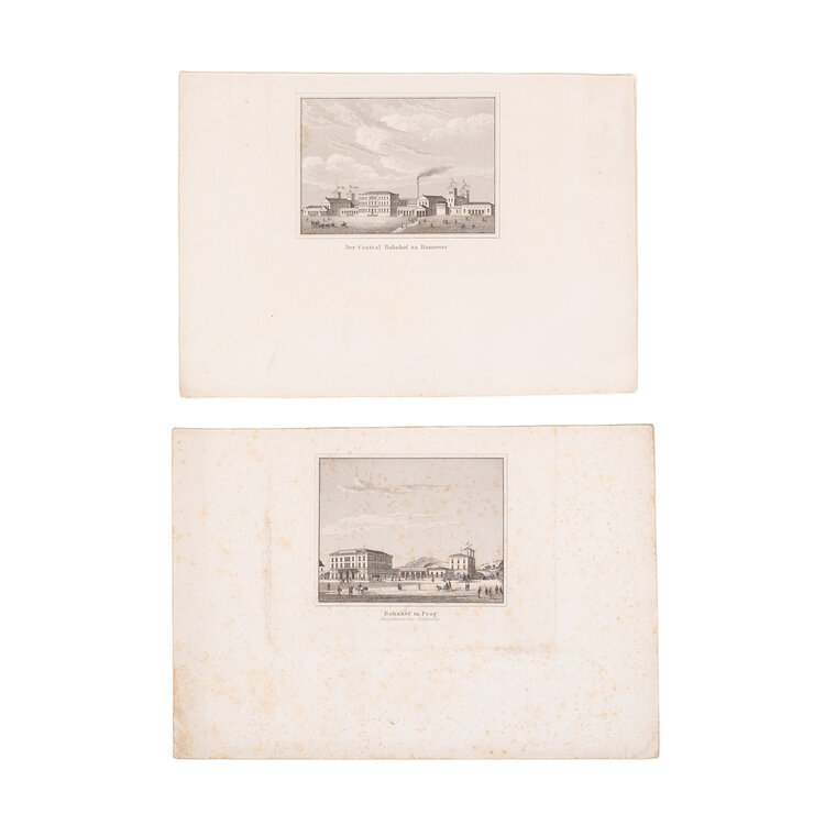 Twee prenten van treinstations: 'Bahnhof in Prag. Ansicht von der Stadtseite'. Gravure en ets van het treinstation Praag Masarykovo Nádraží, Tsjechië. Datering: ca. 1845; 'Der Central-Bahnhof zu Hannover'. Gravure en ets van het Centraal Station in Hannover, Duitsland. Datering: ca. 1850. Conditie: De prenten hebben sporen van ouderdom. Verkleuring, vlekken en kleine beschadigingen aan de randen. Afmetingen van papier prenten: ca. 17,5 x 26 cm; ca. 17 x 25 cm.