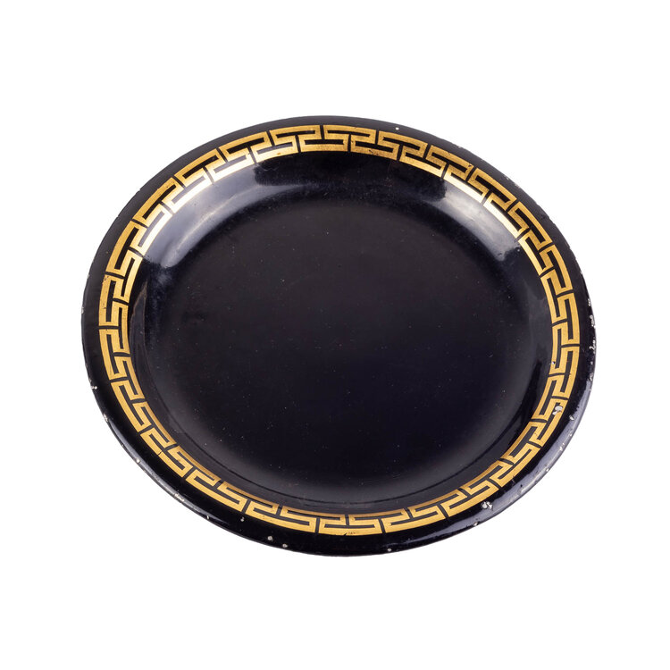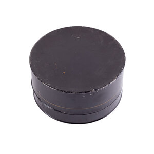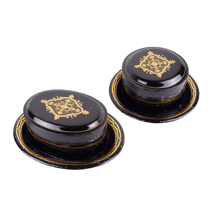 Twee zwart gelakte blikken met gouden opdruk en bijbehorend onderblad. Een ovalen blik en een ronde. Aan de binnenzijde van de deksels gemerkt met het inventarisnummer van het museum. Datering: onbekend. Conditie: op verschillende plekken lakschade, maar nog in mooie staat. Afmetingen: ca. 8 x 20 x 17 cm en 8 x ø 18cm.