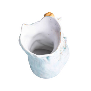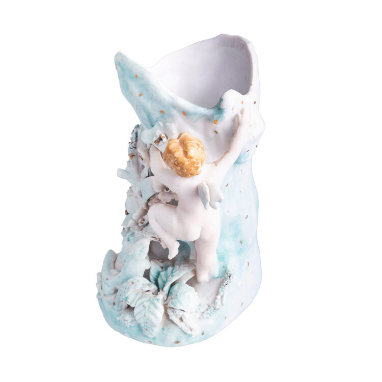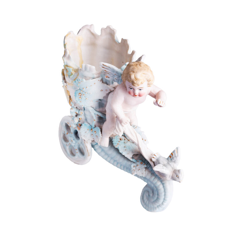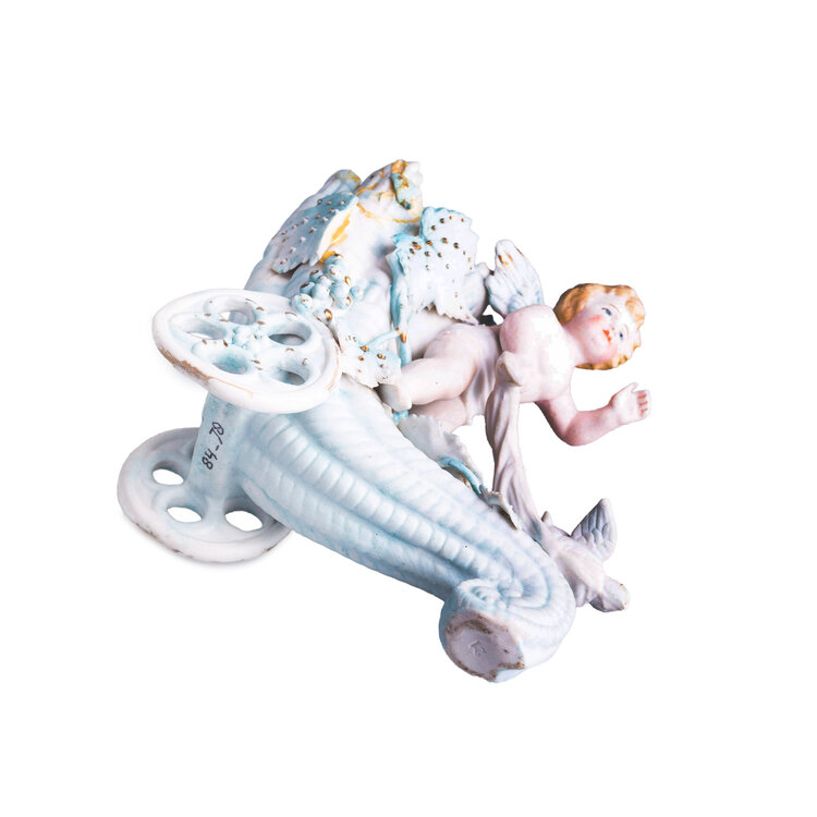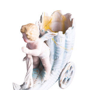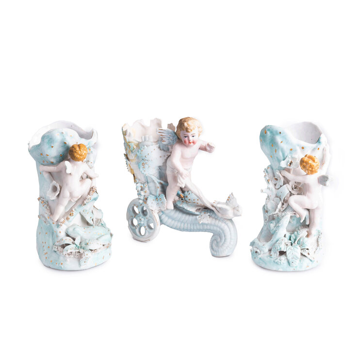 Twee vaasjes en de 'hoorn des overvloeds' van biscuitporselein. De vaasjes zijn in de vorm van een boomstam, waarop een engeltje klimt. Ze zijn gedecoreerd met bloemen, varens en een pad/ salamander. Lichtblauw met gouden stippen, de haren van de engeltjes zijn lichtbruin, kleuraccenten op het gezicht; De 'hoorn des overvloeds' op twee wielen met voorop een engeltje met blauwe vleugeltjes. Hoorn en wielen zijn lichtblauw gekleurd, met voorop een duif. Hoorn voorzien van opgelegde wijnranken. Beide objecten met de hand gekleurd. Datering onbekend. Conditie: Hier en daar stukjes beschadigd, afgebroken. De hoorn des overvloeds is op een aantal plaatsen gelijmd. Afmetingen: vaasjes ca. 13 x 8 x 7 cm, hoorn des overvloeds ca. 13 x 14 x 6 cm.