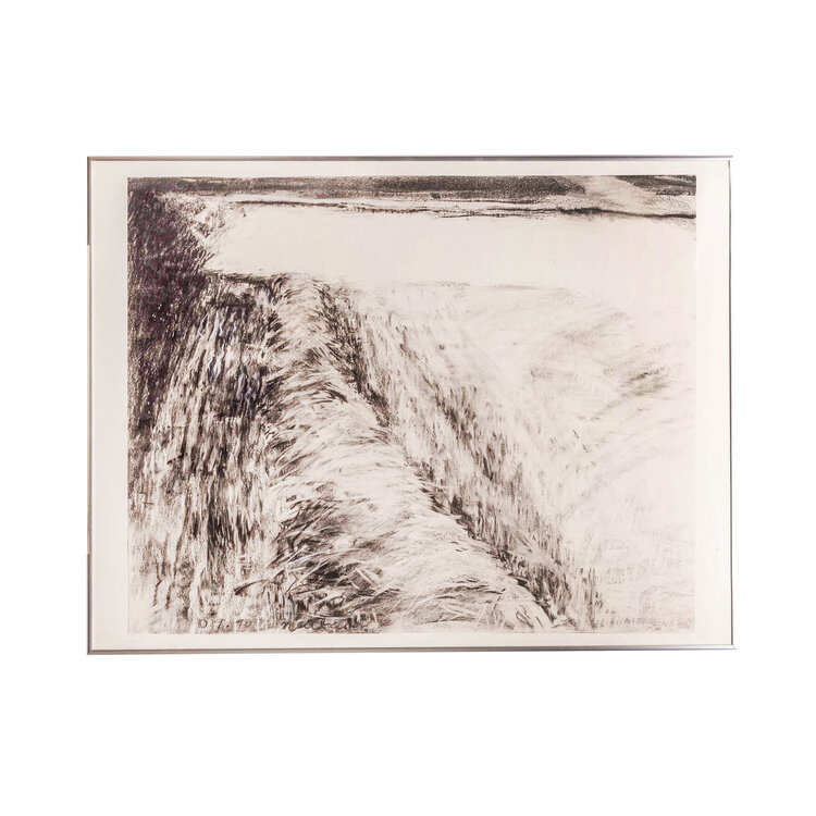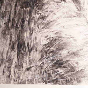 Ursula Neubauer (München, 1939), 'Lichtveld', 1990. Houtskool op papier in metalen lijst met plexiglas. Landschap met bovenin een lichte baan. Signatuur linksonder. Conditie: goed, enkel hier en daar lichte gebruikssporen aan de lijst. Afmetingen lijst: 77 x 98 cm; beeldvlak 70 x 85 cm.