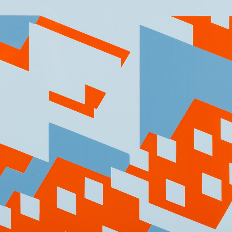 Ursula Pless, Zonder titel, 1985. Zeefdruk op papier in wit/blankhouten lijst, oplage 147/300. Abstract werk met rechthoekige vormen in de kleuren blauw en oranje. Signatuur rechtsonder. Conditie: goed. Afmetingen: lijst 62,5 x 52,5 cm; beeldvlak: 34,5 x 34,5 cm.