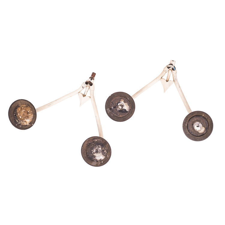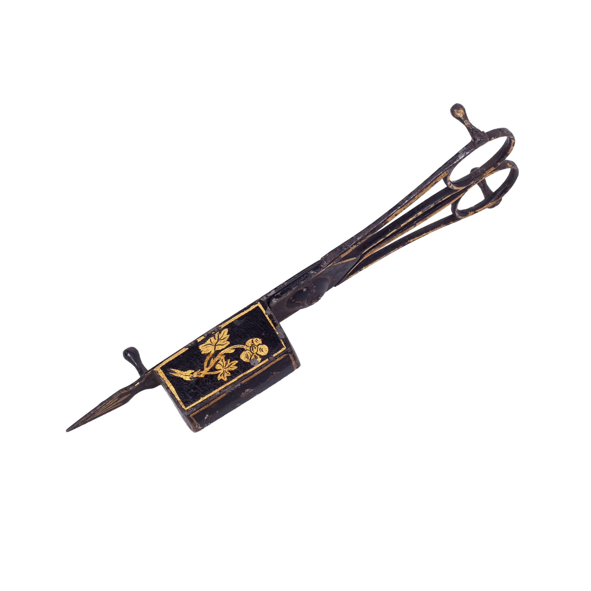 Set bestaande uit: een goud gedecoreerde kaarsendover in schaarmodel, een blauw geglazuurde aardewerk kaarsenstandaard en twee wand kandelaars met nog kaarsvet resten erin. In een van deze loopt elektriciteitsdraad, wat doet vermoeden dat er ooit lampjes op gezeten hebben. Datering: onbekend. Conditie: sporen van gebruik en ouderdom. Afmetingen: 7 x ø 26 cm (en ø 2,5 cm gat), 18 x 5,3 cm en 16 x 25 cm.