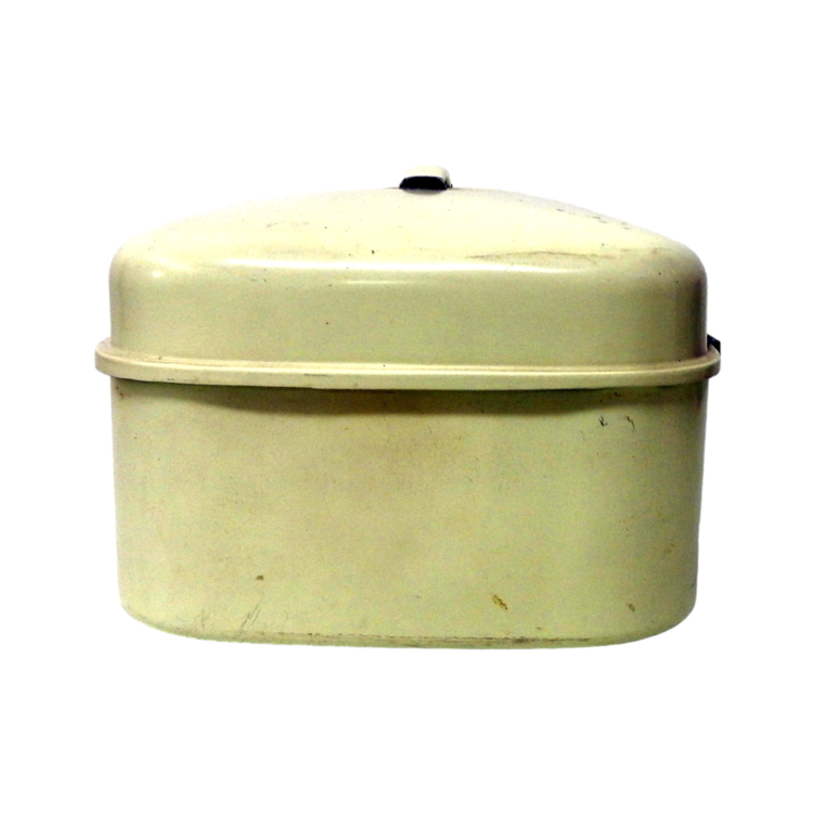 Vintage broodtrommel, jaren 50 van de vorige eeuw. Vintage broodtrommel van crème kleurig emaille met handgreep.