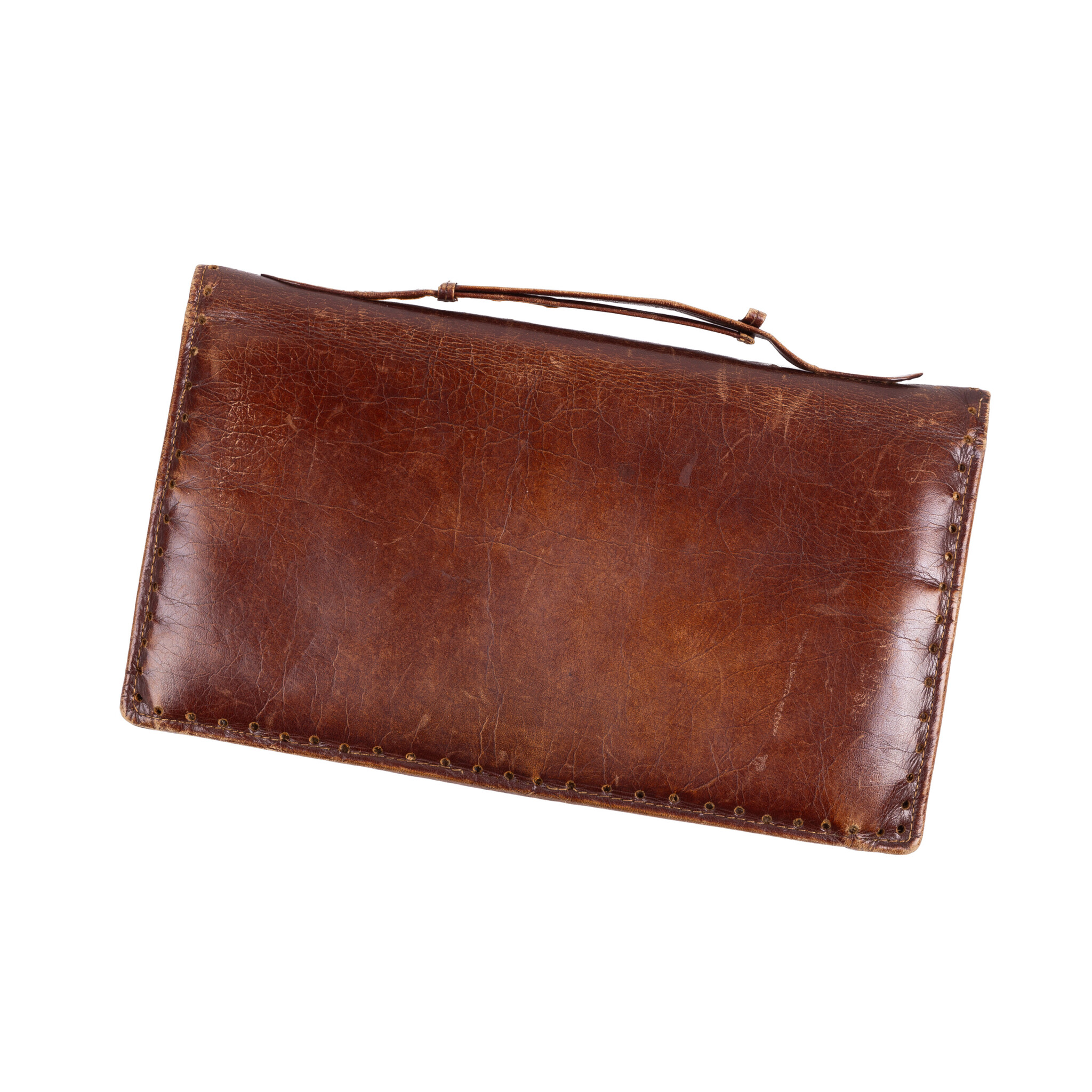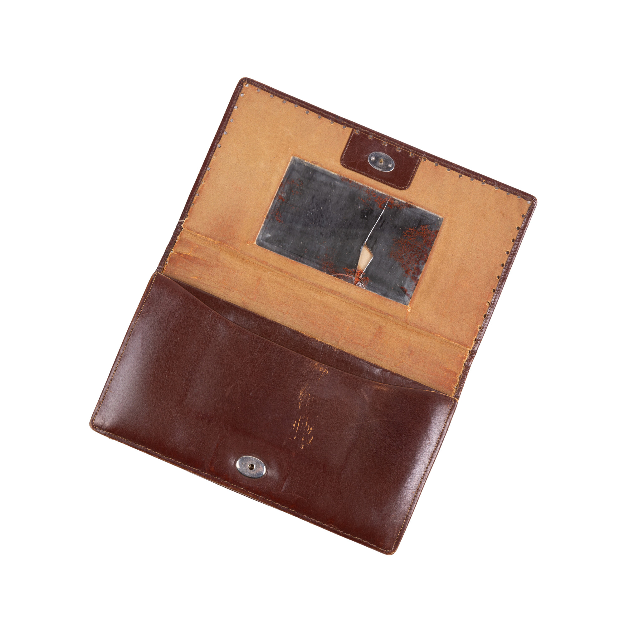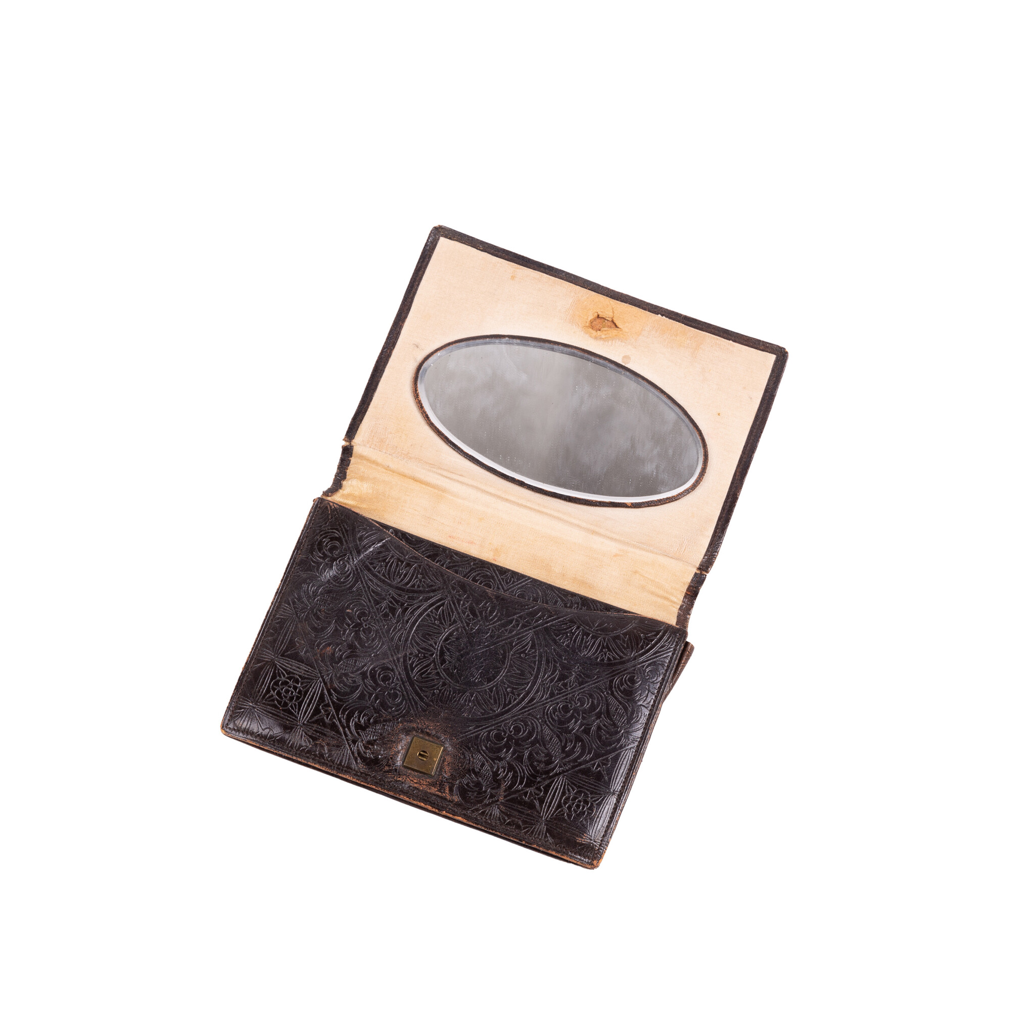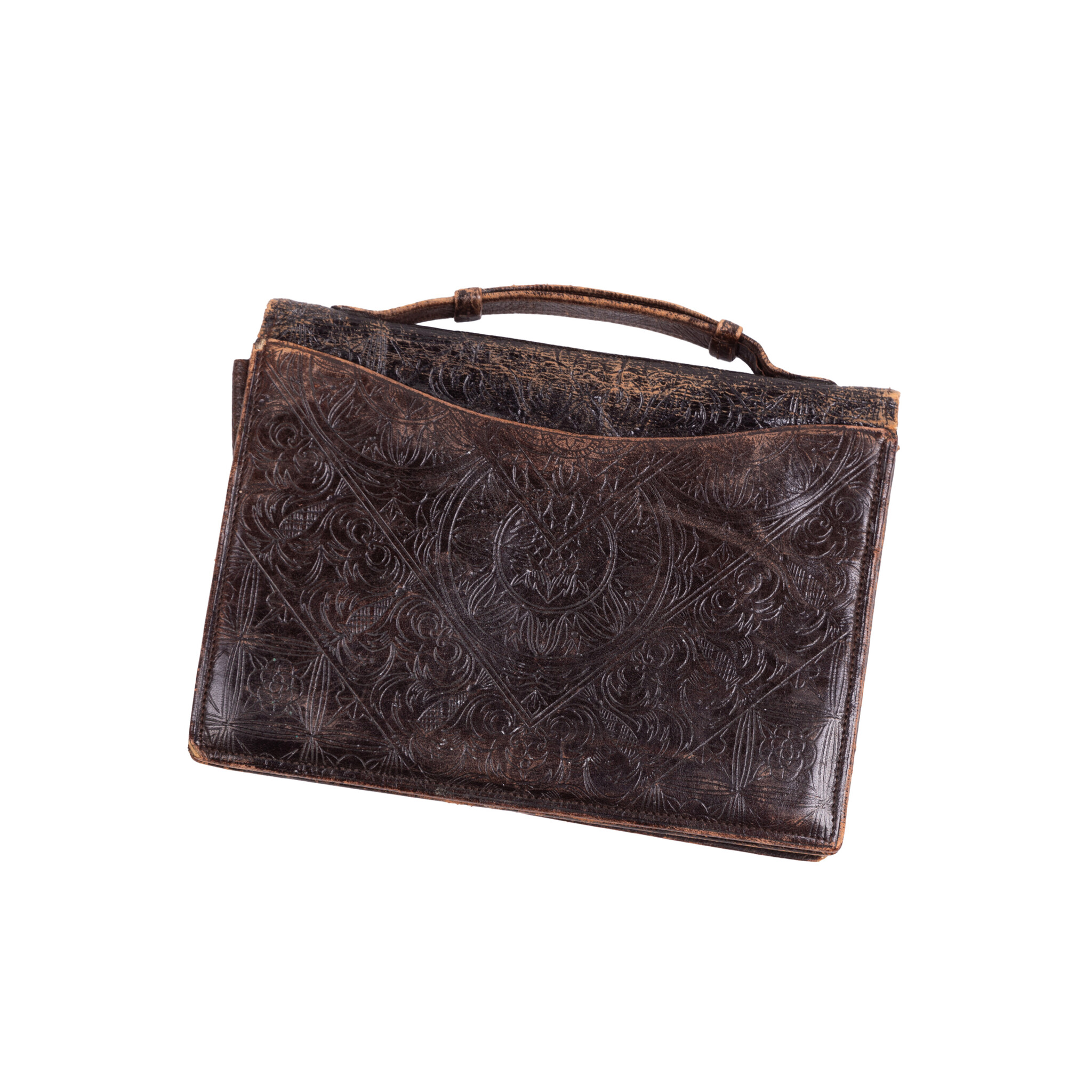 Vintage etuis en portemonnees, 20ste eeuw. Het bruine leren etui is bewerkt met bloemmotieven en heeft een handvat. Aan de binnenzijde zit een spiegeltje (kapot) en drie compartimenten, waarvan de middelste een knipsluiting heeft; Een tweekleuren bruin etui, met goudkleurige versieringen en aan de binnenzijde een spiegeltje; Een leren portemonnee met bloemmotief in bruintinten met knipsluiting; Een klein bruin leren portemonneetje met beslag, aan de binnenzijde zijn twee compartimenten. Conditie: vertonen sporen van gebruik, zoals slijtage, verkleuringen en beschadigingen; sluitingen van etuis ontbreken of werken niet meer. Afmetingen etui: ca. 14 x 24 x 2 cm; Afmetingen tweekleuren etui: ca. 11 x 16 x 1 cm; Afmetingen portemonneetje: ca. 9 x 17,5 x 1 cm; Afmetingen portemonneetje: ca.5 x 8,5 x 2 cm.