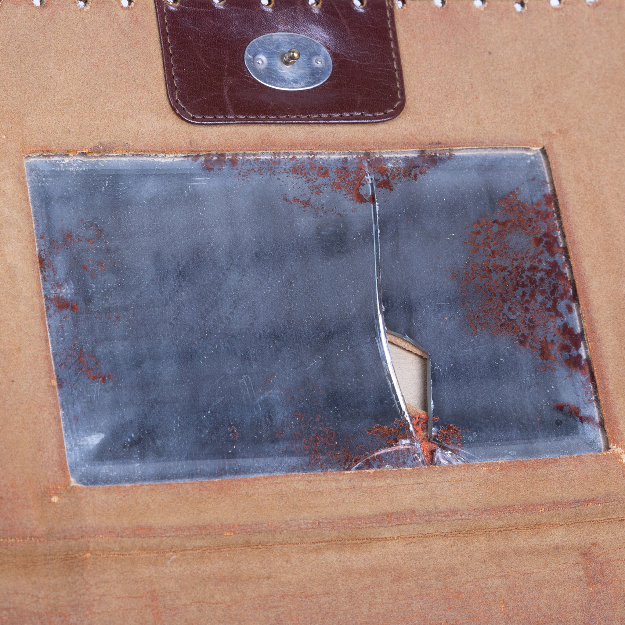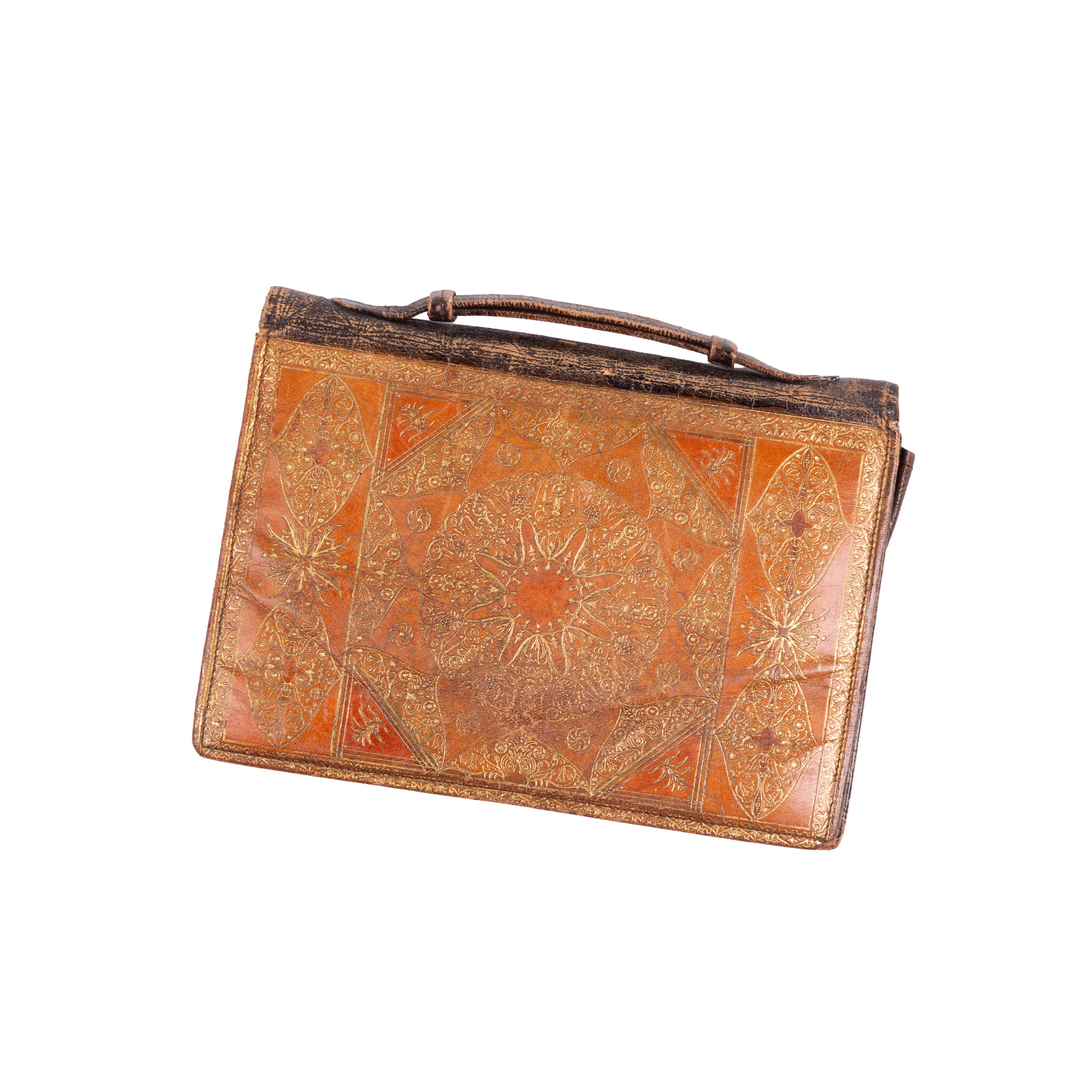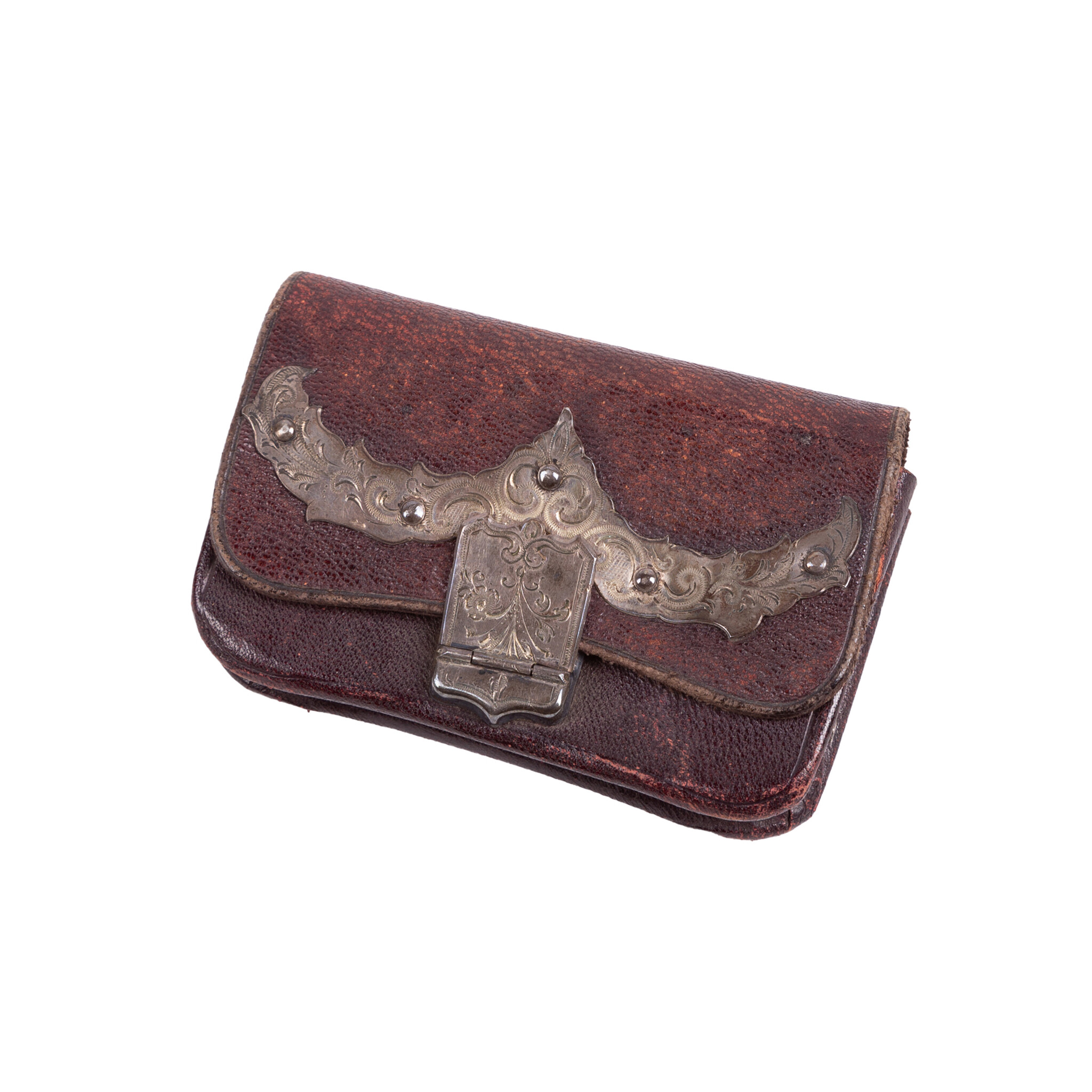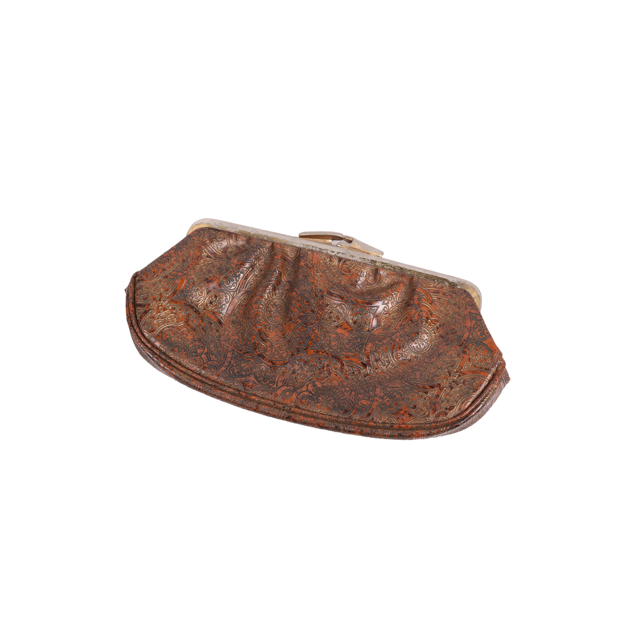 Vintage etuis en portemonnees, 20ste eeuw. Het bruine leren etui is bewerkt met bloemmotieven en heeft een handvat. Aan de binnenzijde zit een spiegeltje (kapot) en drie compartimenten, waarvan de middelste een knipsluiting heeft; Een tweekleuren bruin etui, met goudkleurige versieringen en aan de binnenzijde een spiegeltje; Een leren portemonnee met bloemmotief in bruintinten met knipsluiting; Een klein bruin leren portemonneetje met beslag, aan de binnenzijde zijn twee compartimenten. Conditie: vertonen sporen van gebruik, zoals slijtage, verkleuringen en beschadigingen; sluitingen van etuis ontbreken of werken niet meer. Afmetingen etui: ca. 14 x 24 x 2 cm; Afmetingen tweekleuren etui: ca. 11 x 16 x 1 cm; Afmetingen portemonneetje: ca. 9 x 17,5 x 1 cm; Afmetingen portemonneetje: ca.5 x 8,5 x 2 cm.