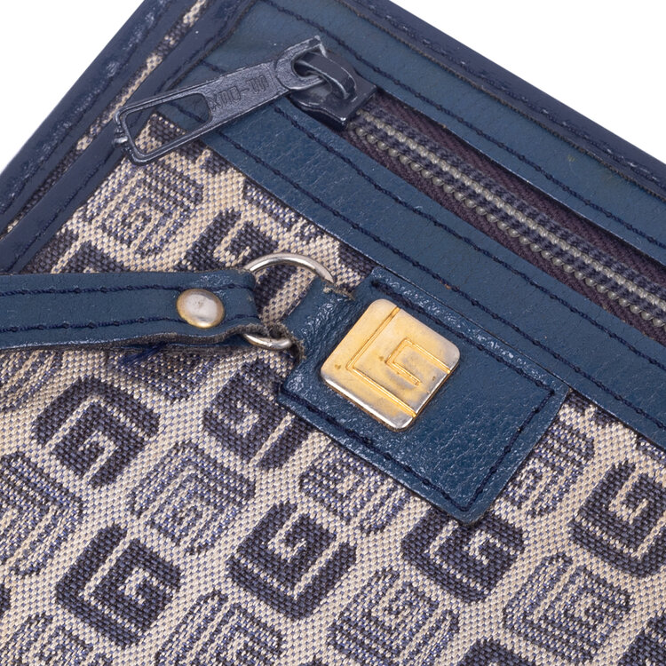 Vintage clutch van Guy Laroche in beige textiel, bedrukt met logo's in zwart. De clutch heeft een ritssluiting, een donkerblauw leren polsbandje en is afgezet met donkerblauw leren biezen. Datering onbekend. Conditie: vertoont gebruikssporen. Afmetingen: 18 x 29,5 x 5 cm.